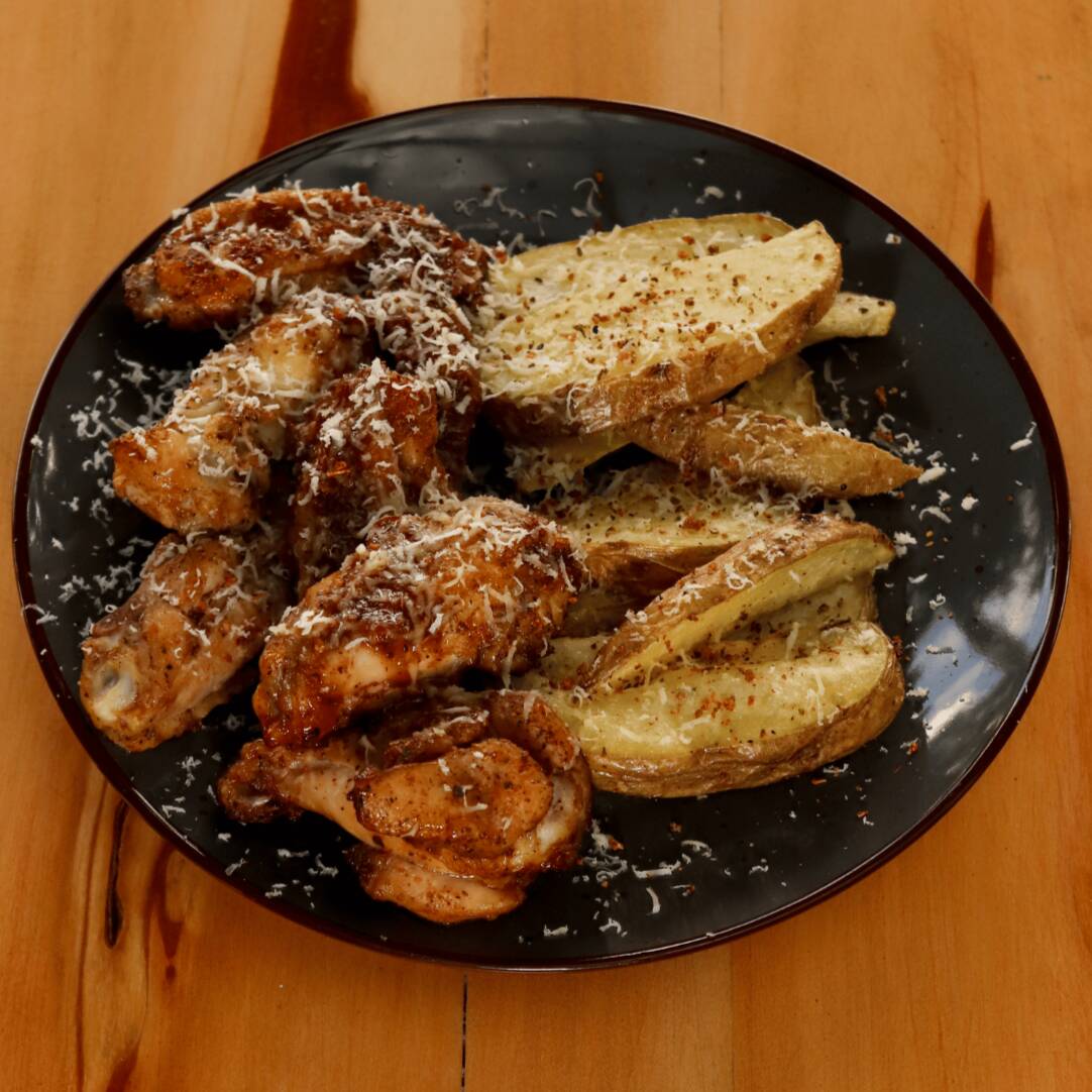 6 jugosas alitas de pollo bañadas en una deliciosa salsa BBQ, acompañadas de crujientes papas rústicas horneadas.