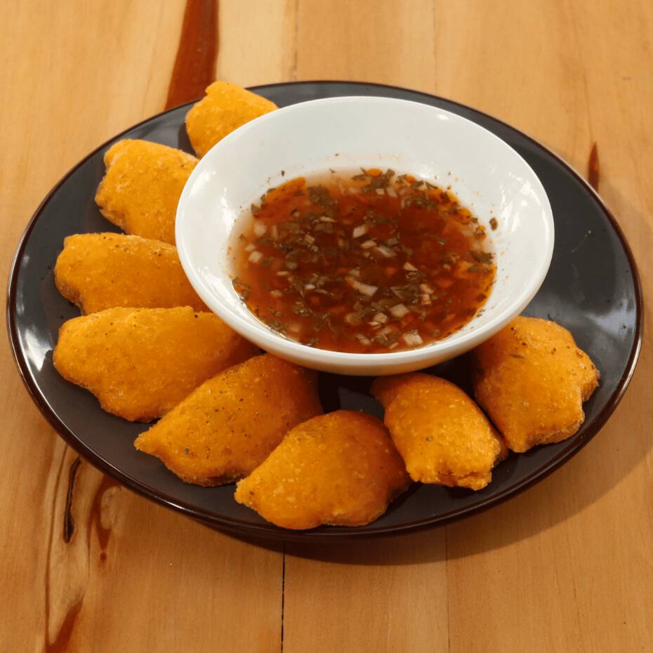 Ocho empanadas doradas y crujientes, servidas con encurtido de tu elección (ají o guacamole)