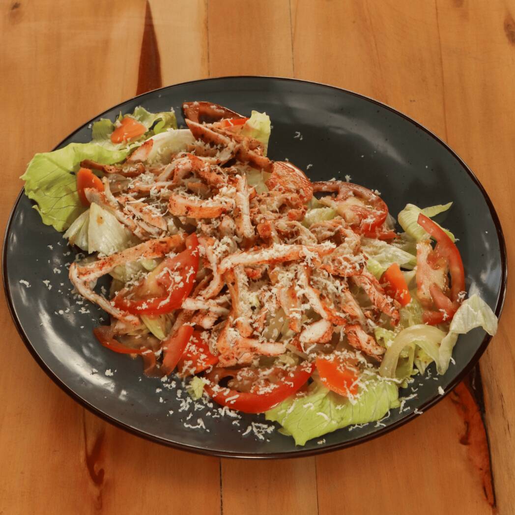Mix de hojas con pollo en trozos, tomate, encurtidos, vinagreta de balsámico y semillas crocantes