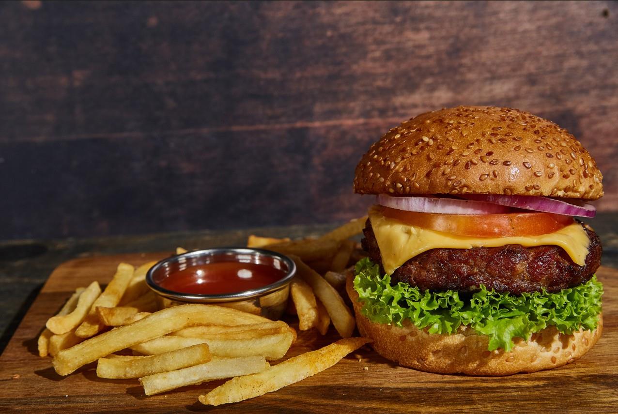 Carne de 150 g, queso cheddar, lechuga crespa, tomatey cebolla roja. Aparte salsa picante medio. Acompañante a elección.
