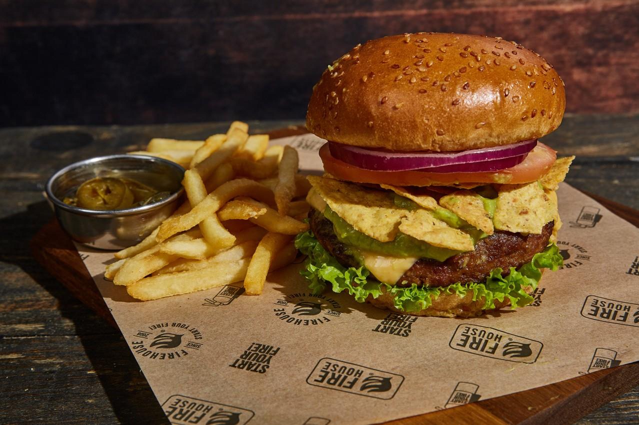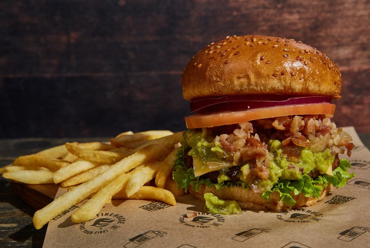 Carne de 150 g, queso cheddar, guacamole firehouse, lechuga,tomate, cebolla roja. aparte mayo picante. Acompañante aelección.