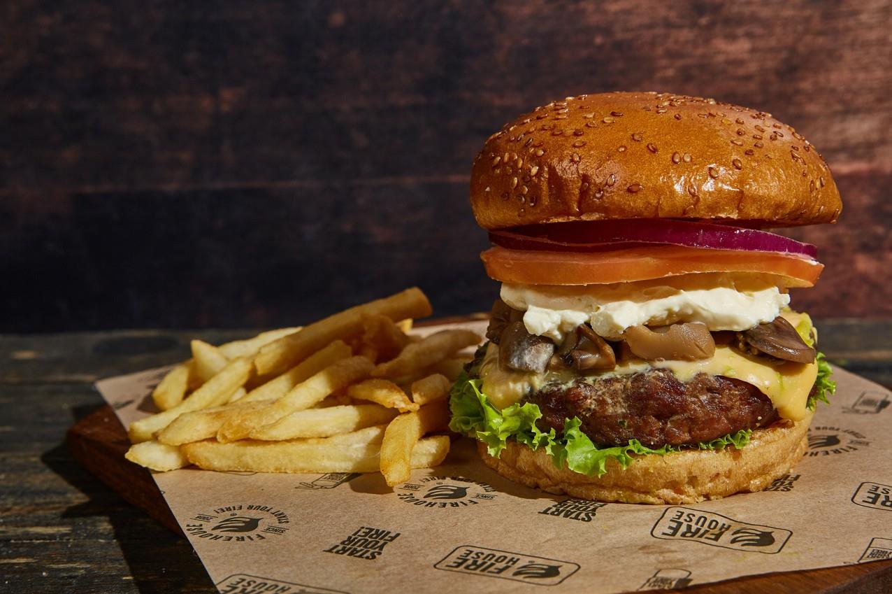 Hamburguesa 150gr rellena de queso, queso crema, tocineta firehouse, lechuga crespa, tomate y cebolla roja. acompañante a elección.