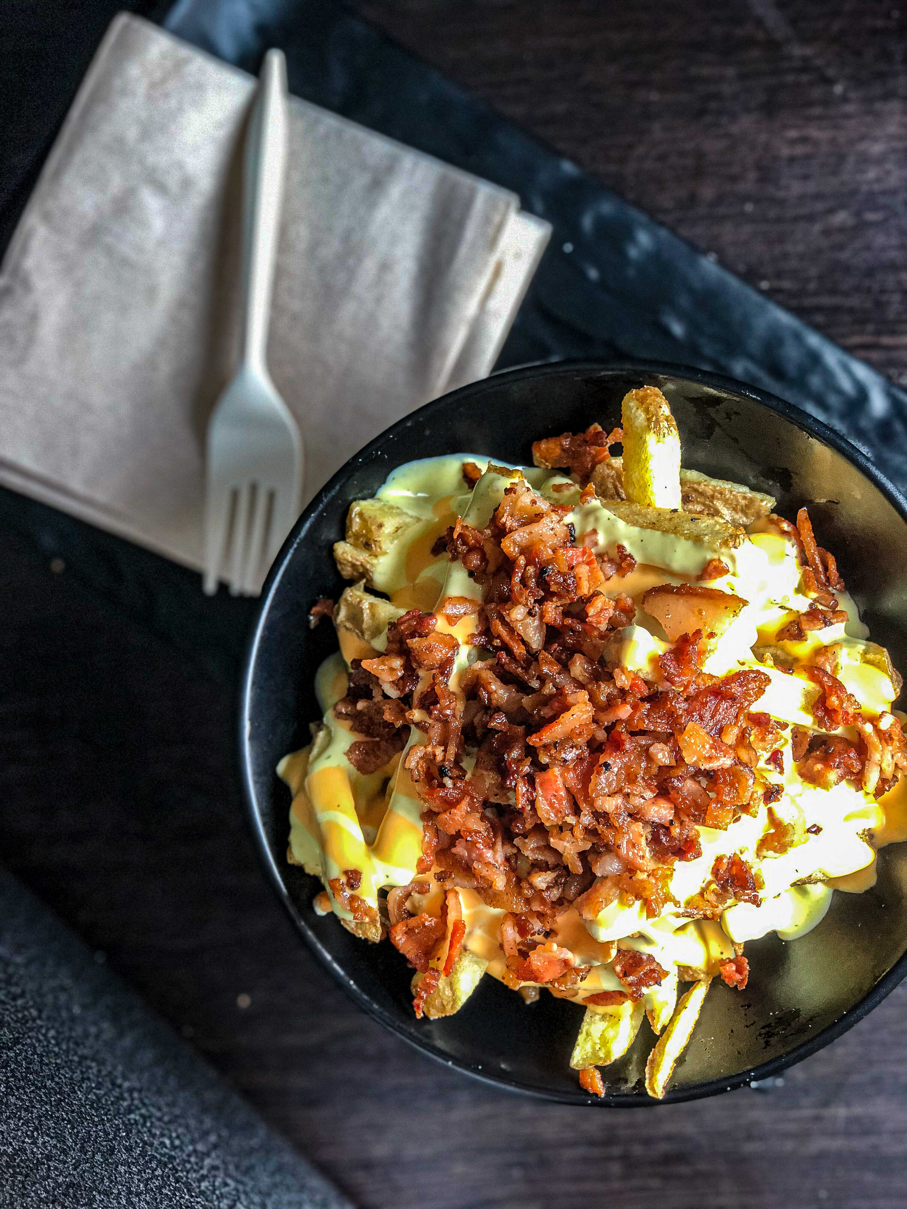 Papas francesas al estilo americano con salsa de queso cheddar y tocineta crocante.