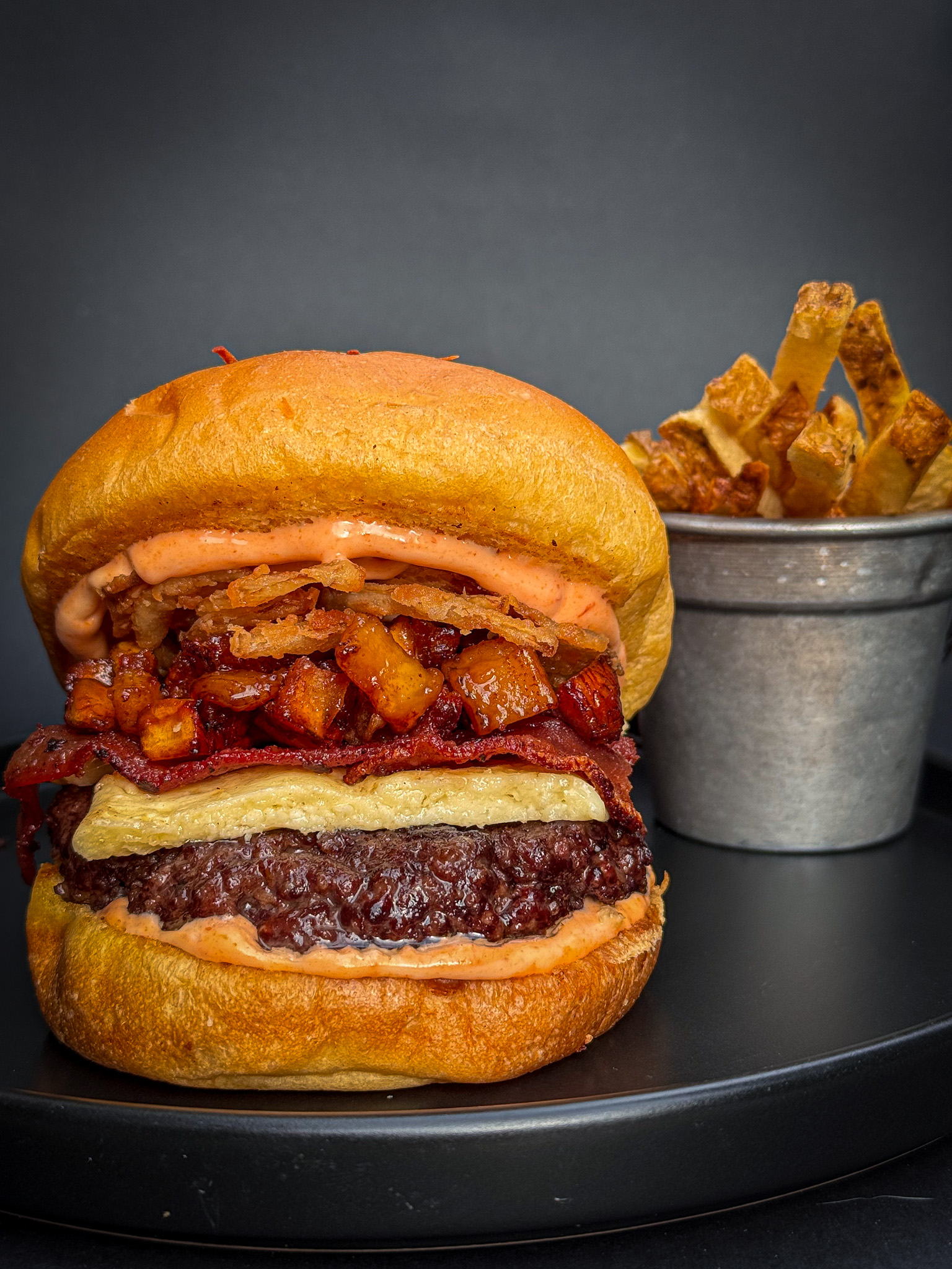 Hamburguesa con carne de res, pan brioche en mantequilla, mayosiracha, queso costeño asado, mermelada de piña oro miel, cebolla crispy, y tocineta crujiente con maduritos en en reducción de maple. Acompañado de papas francesas.