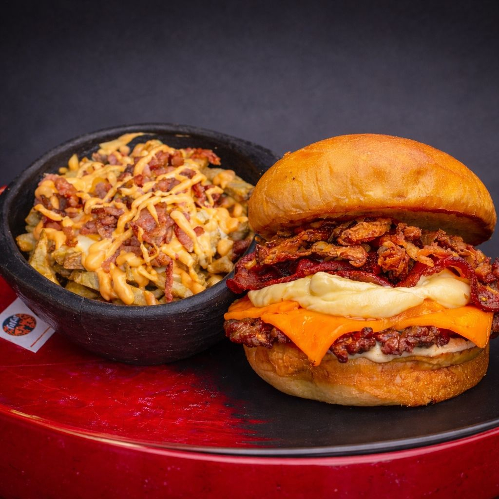 Hamburguesa con carne de res tipo Smash y pulled pork en cocción lenta, bañada en salsa BBQ de la casa, queso mozarella y lechuga fresca y mayo aguacate. Acompañada de papas a la francesa.