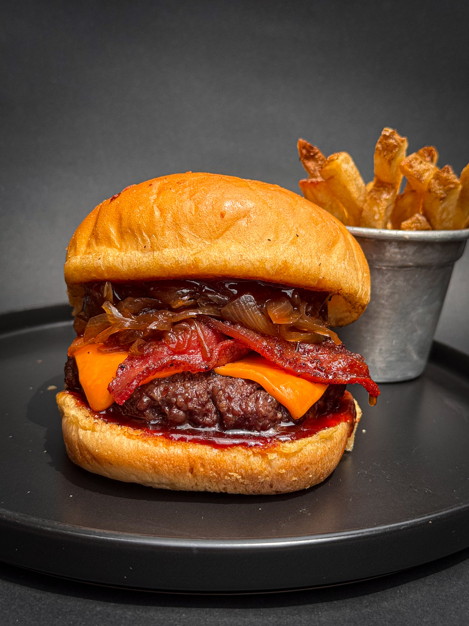 Hamburguesa con carne de res 150gr, tocineta, cebolla caramelizada, queso cheddar, acompañado de papas francesas.
