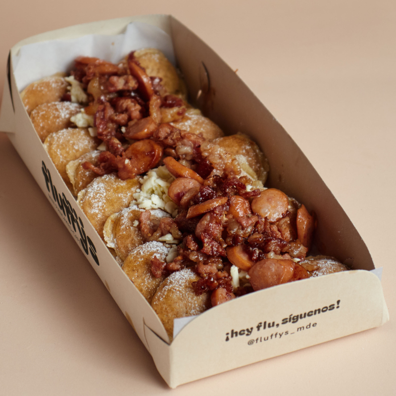 10 Mini pancakes mezcla clásica, salchicha ranchera y queso rallado.