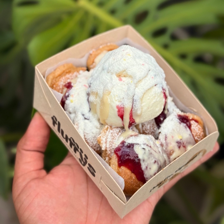 24 mini pancakes mezcla clásica, mermelada artesanal de frutos rojos, dos bolas de helado de vainilla, cobertura de chocolate blanco y doble porción de lluvia de quipitos