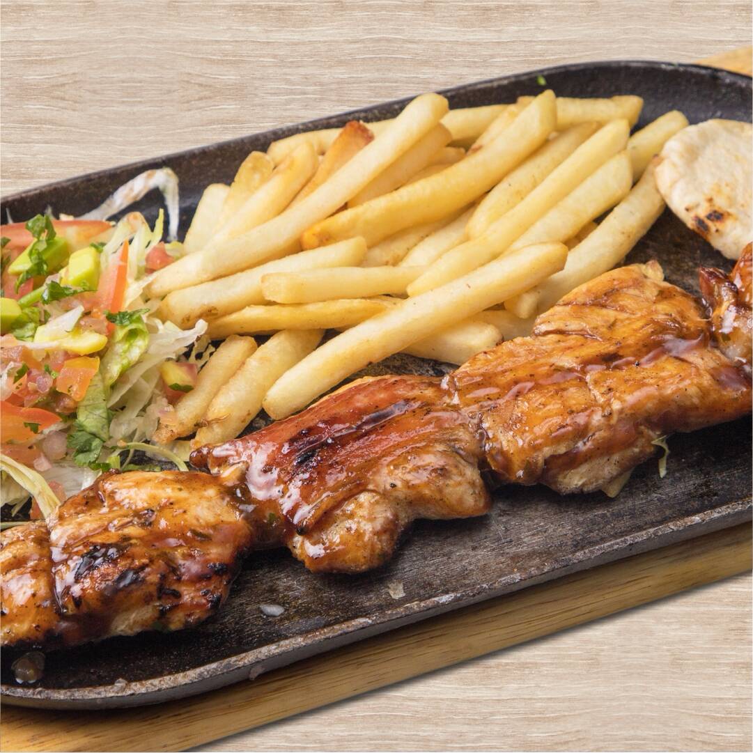 250gr de pechuga asada, bañada en salsa BBQ de la casa, papas a la francesa arepa y ensalada.