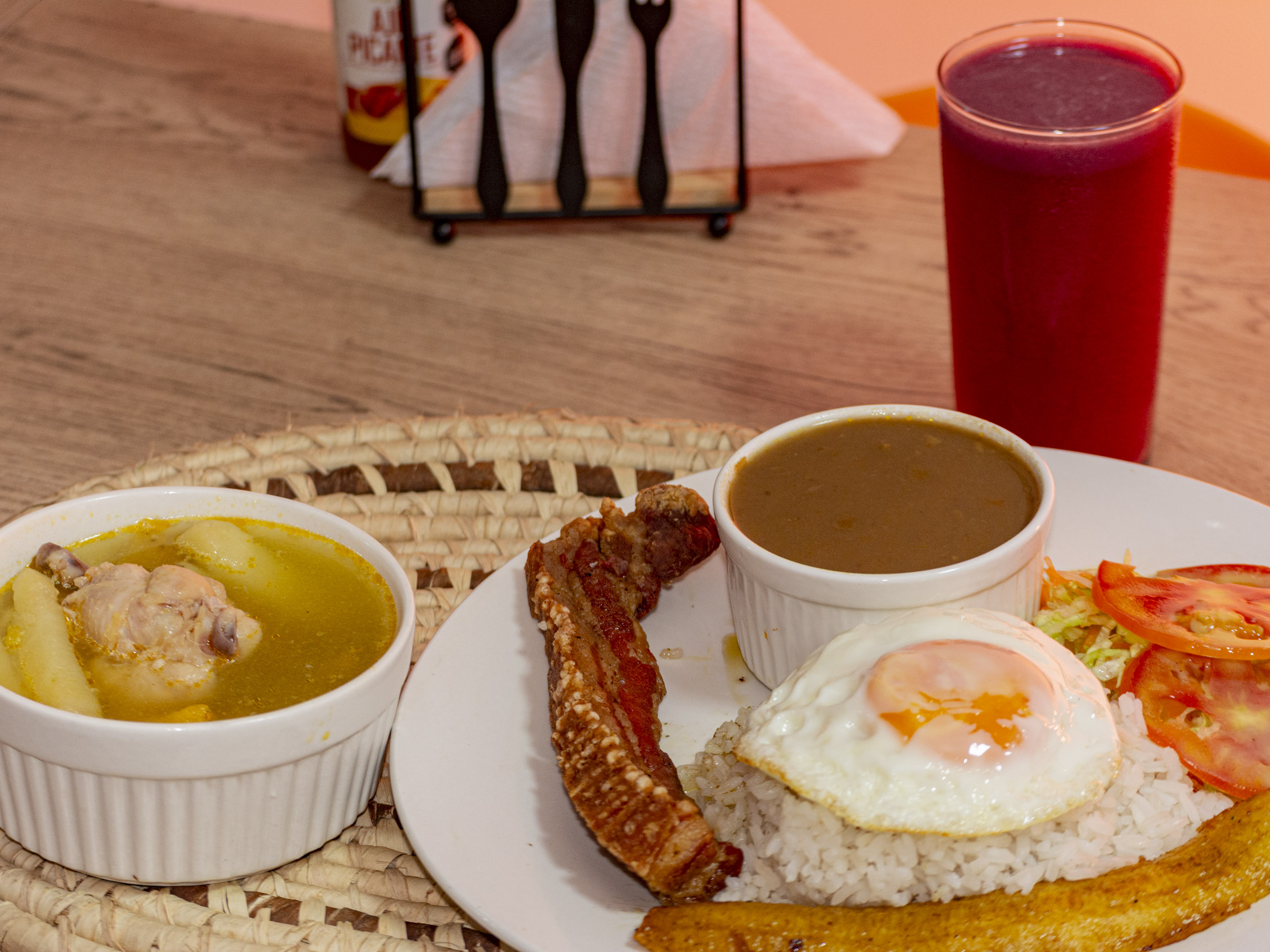 150 gramos de Lomo de Cerdo+ Arroz + Grano disponible (lenteja o frijol) + Maduritos + Sopa (10-12 Onzas)+ Bebida