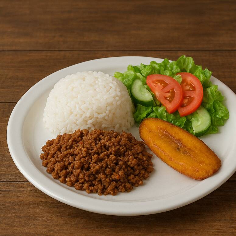 Arroz, carne molida, plátano maduro o papas a la francesa, ensalada, sopa de Frijol 8 Oz mas gaseosa 250 ml GRATIS.