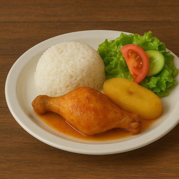 Arroz, pollo sudado, papa sudada, ensalada, sopa de sancocho más gaseosa 250 ml GRATIS.