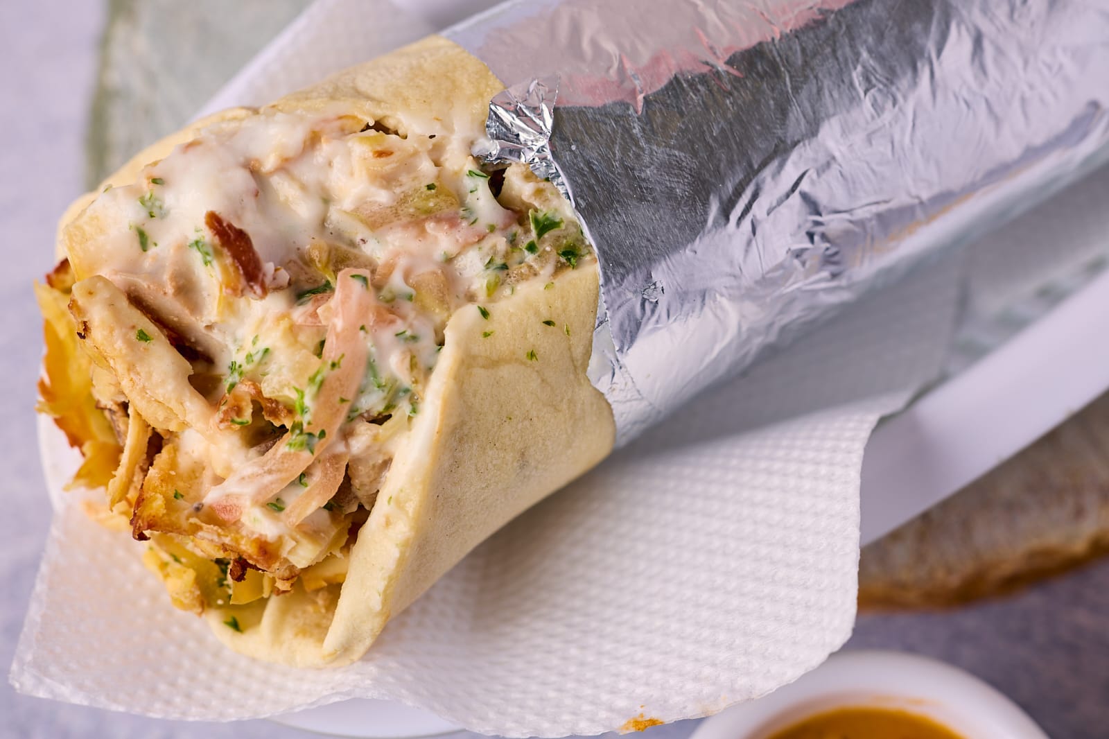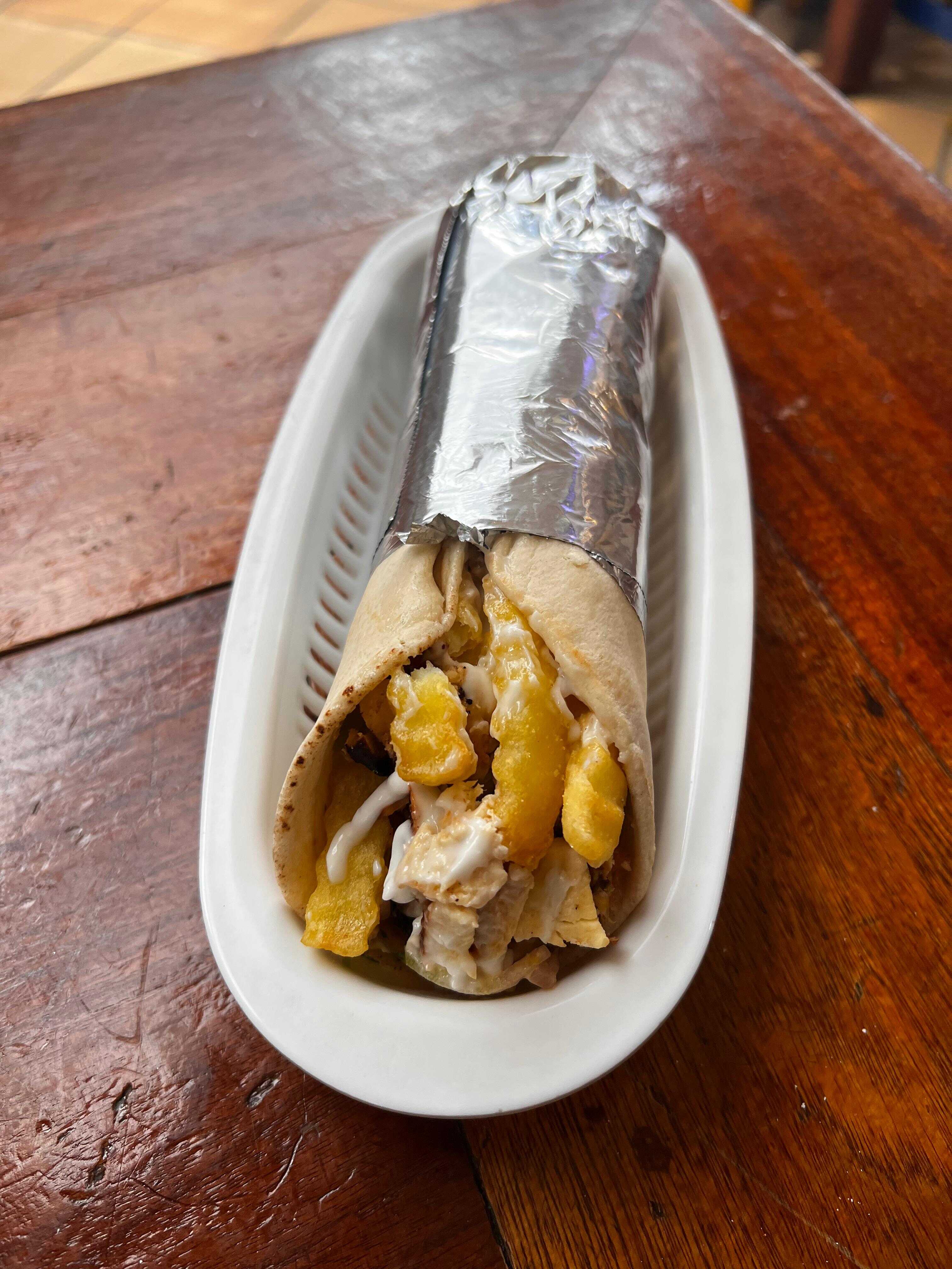 Pan árabe, pollo, papas francesas DENTRO del shawarma, cerdo y tomate, perejil y salsa de ajo.