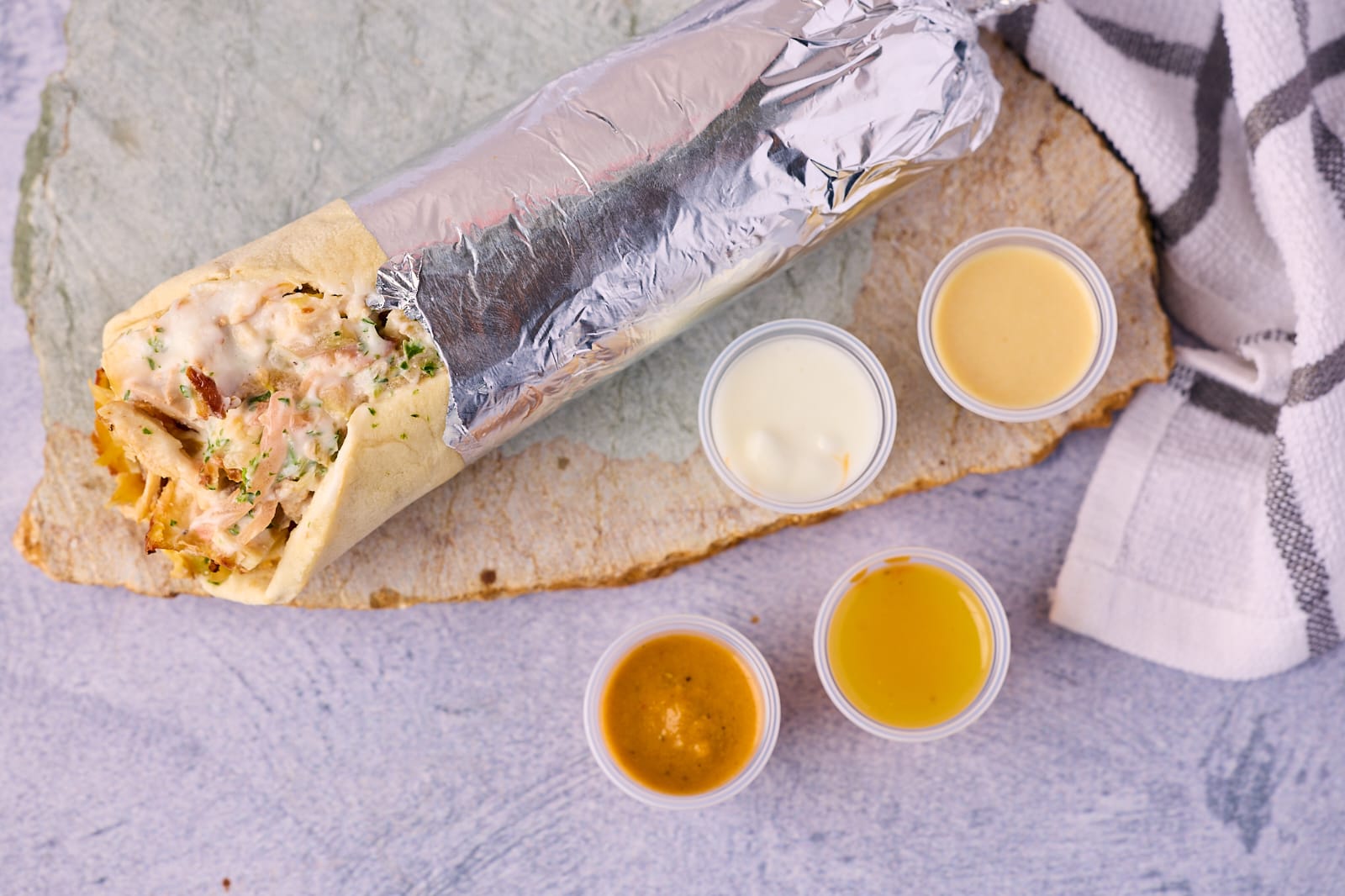 Pan árabe, pollo y falafel, tomate, perejil y salsa de ajo.