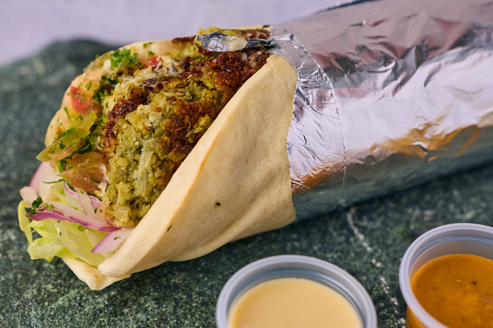 Pan árabe, cerdo y falafel, tomate, perejil y salsa de ajo.