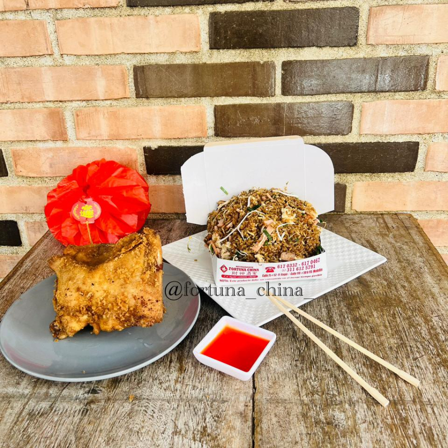 2 porciones de arroz con julianas de pollo, cerdo, jamón, acompañadas de raíces chinas, cebolla y salsa agridulce.