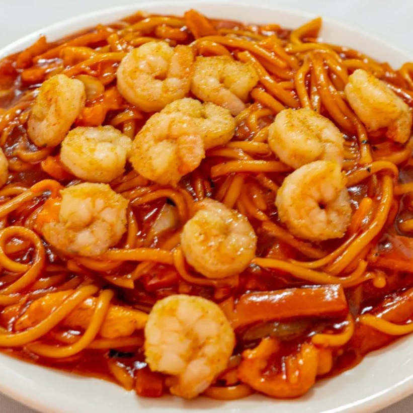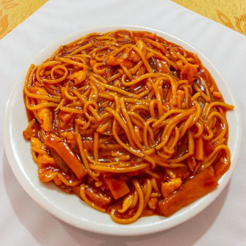 Espaguetti con pollo, cerdo, jamón y camarones, 6 porciones.