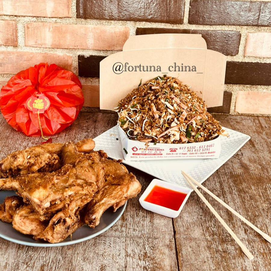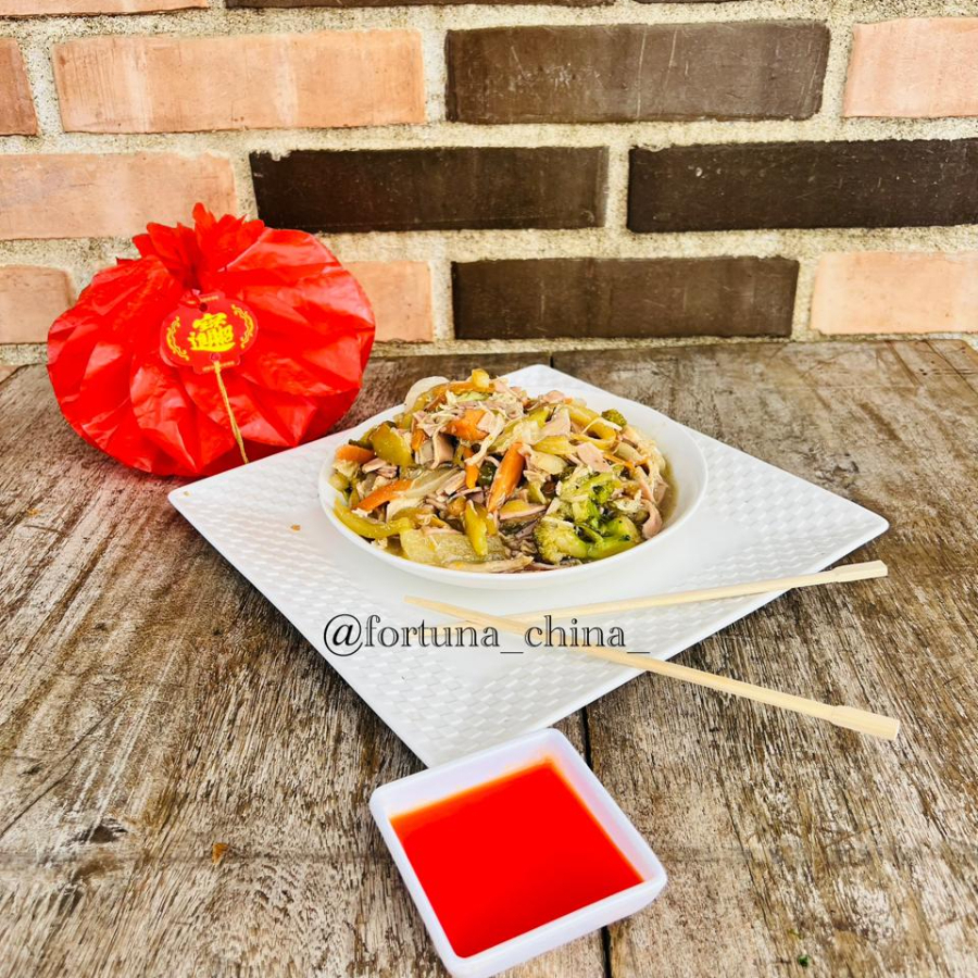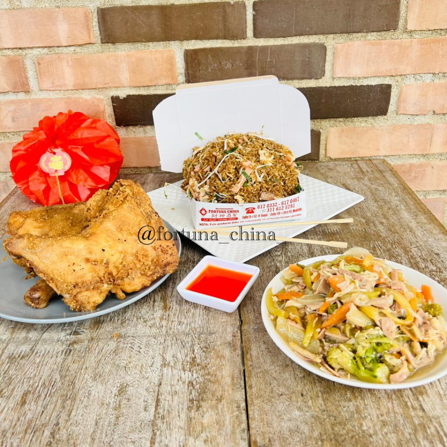 Arroz con julianas de pollo, cerdo, jamón, raíces chinas, cebolla y salsa agridulce + Chop Suey con pepinos, brócoli, pimentón, cebolla, zanahoria y carne.