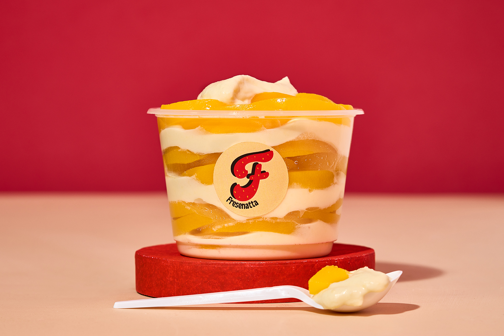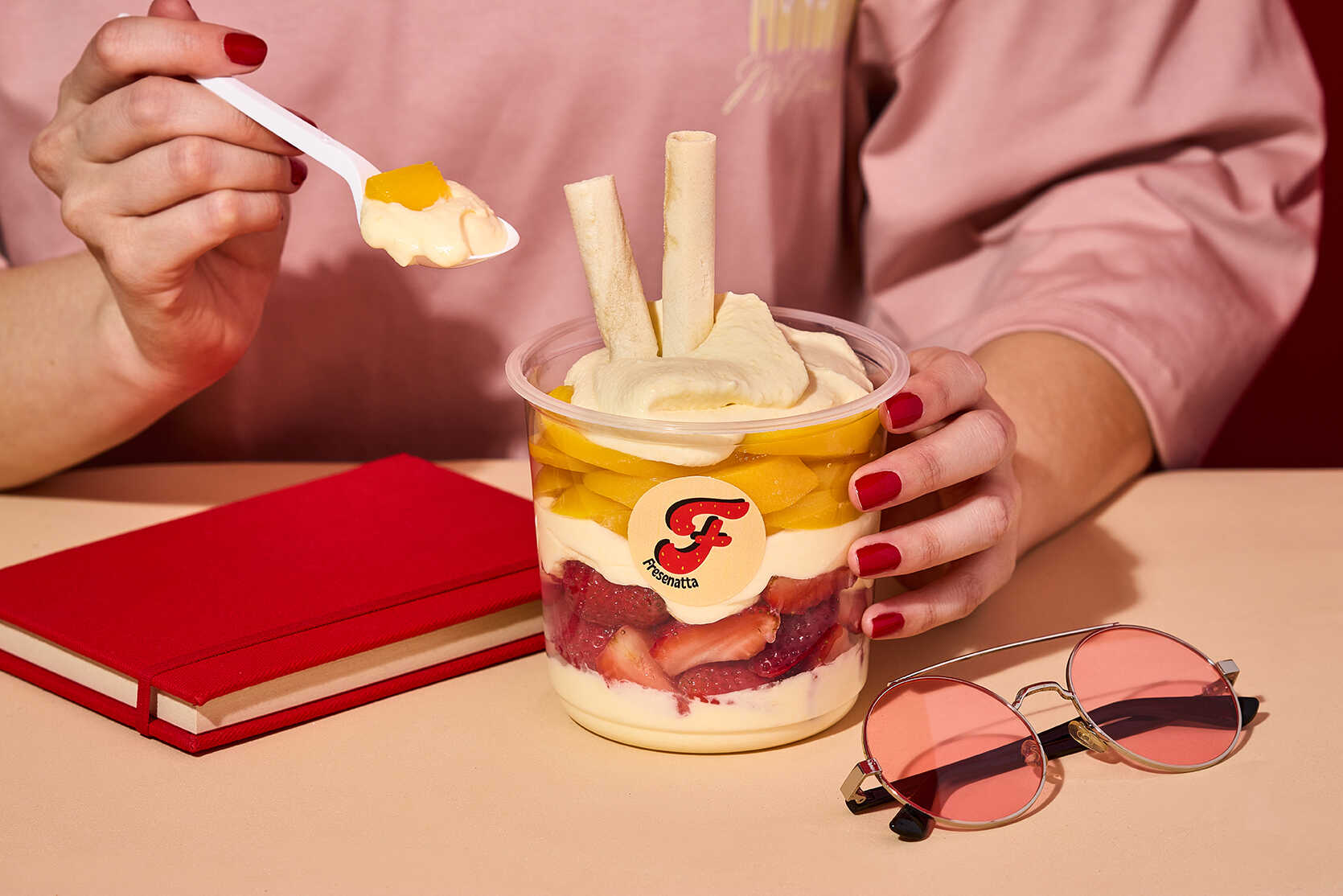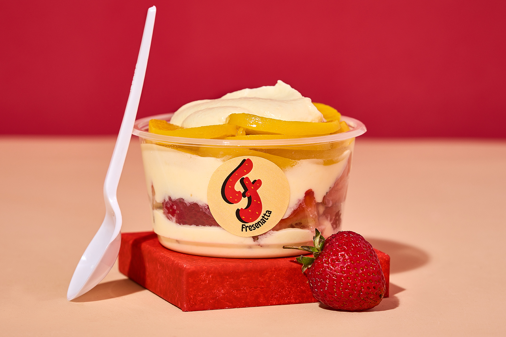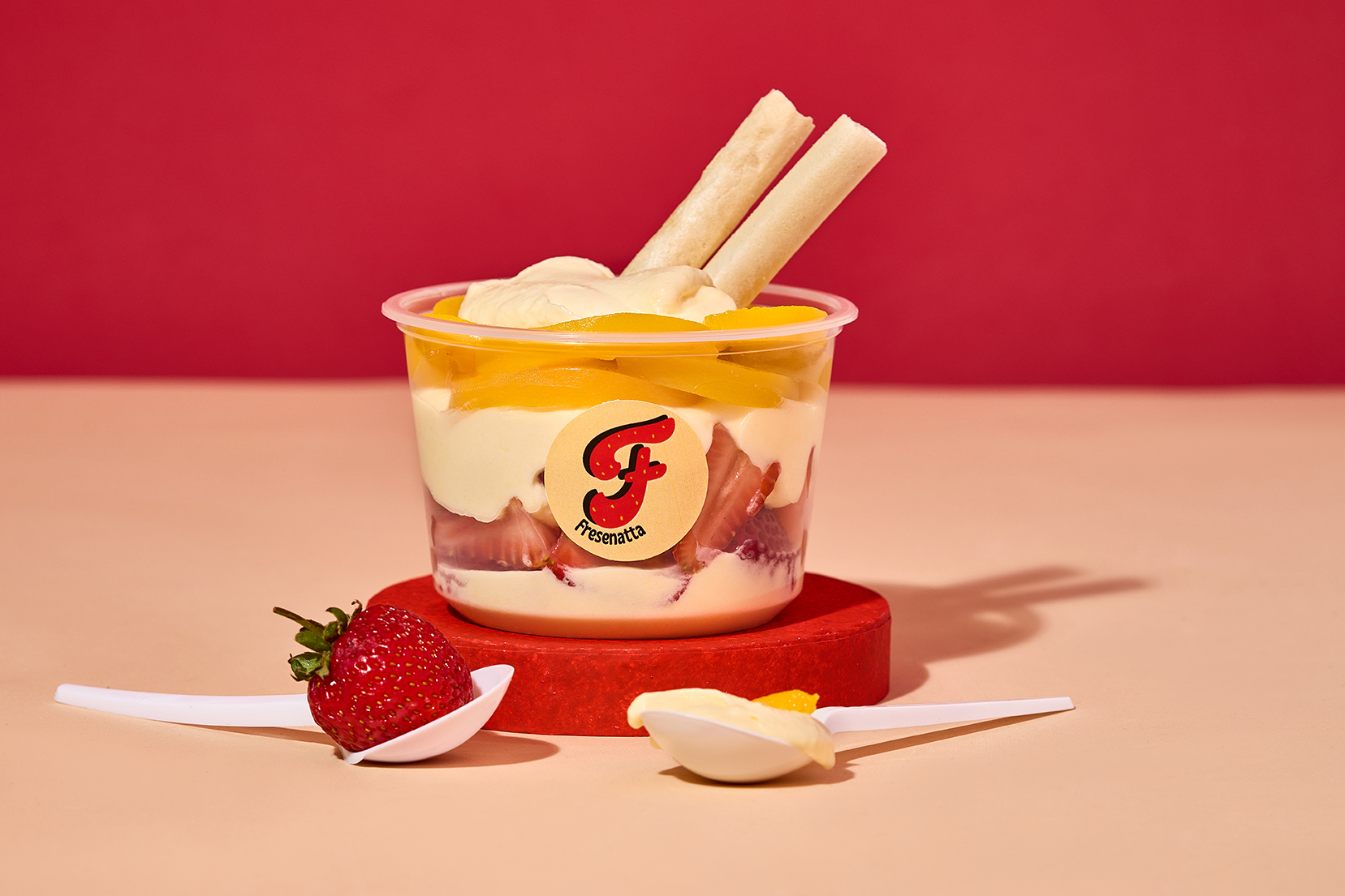 fresas y durazno con crema artesanal de la casa, acompañadas de barquillo y salsa a elegir, 24 oz.