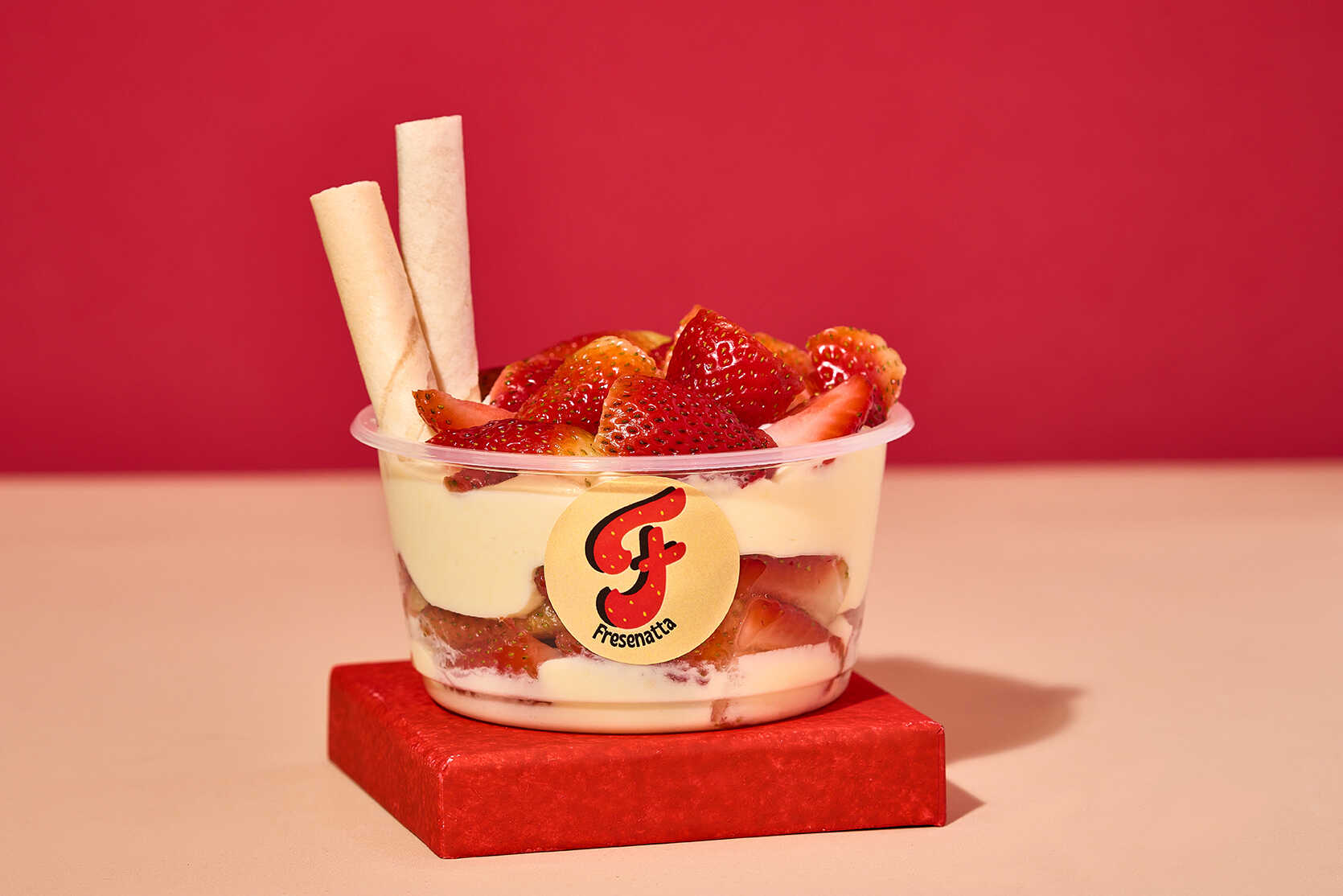 fresas con crema artesanal de la casa, acompañadas de barquillo y salsa a elegir, 16 oz.