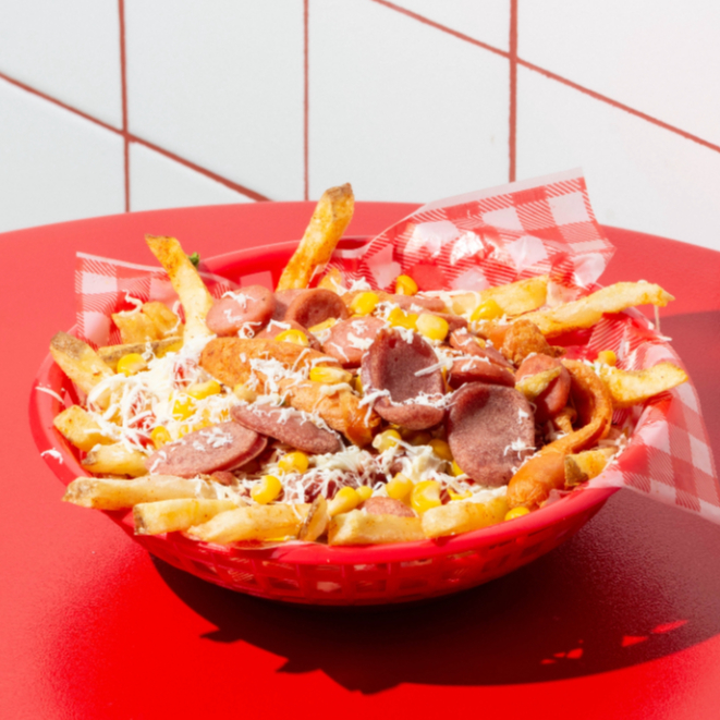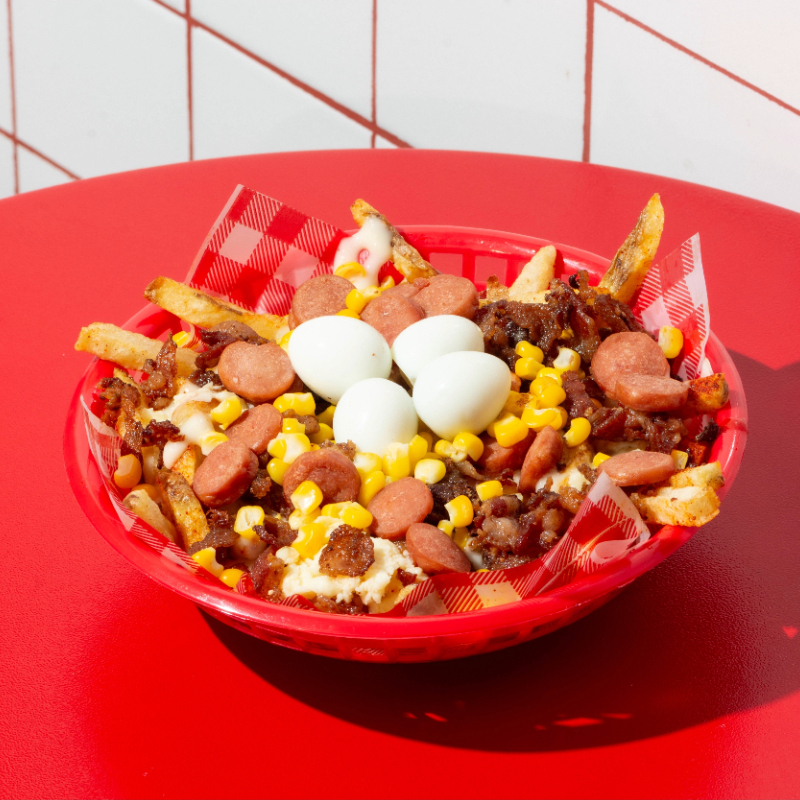 Papas a la francesas 250 g, queso rallado, salchicha, tocineta, maicitos, huevo de codorniz, salsa BBQ y ajo.