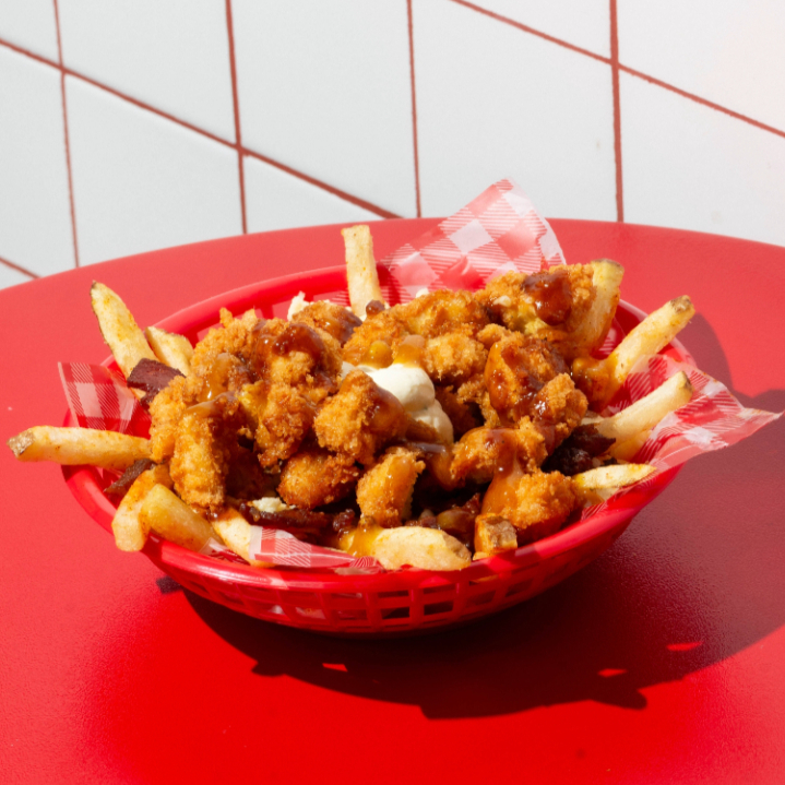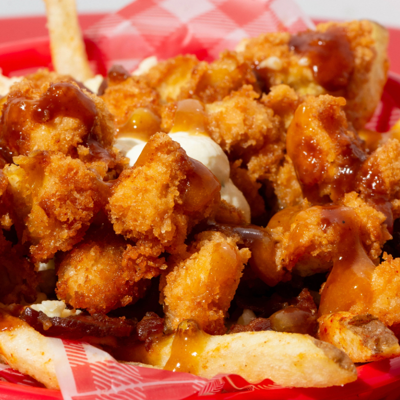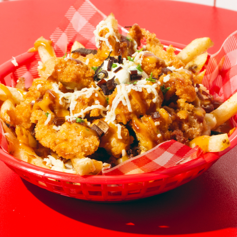 Papas a la francesa 250 g, pollo crocante bañado en miel, tocineta picada, queso mozzarella, sour cream de siracha, salsa rosada de la casa, BBQ ranch y puerro crocante.