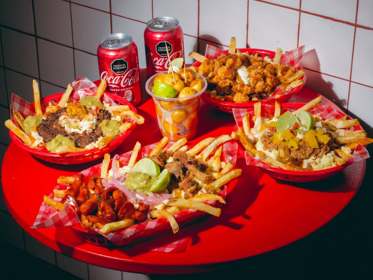 Papas a la francesas 480 g, salchicha, butifarra, chorizo, queso costeño, maicitos, lechuga fresca, ripio de plátano, salsa roja, piña y suero costeño.