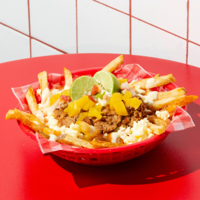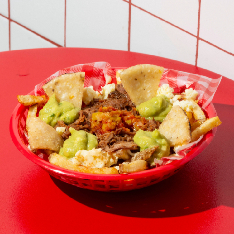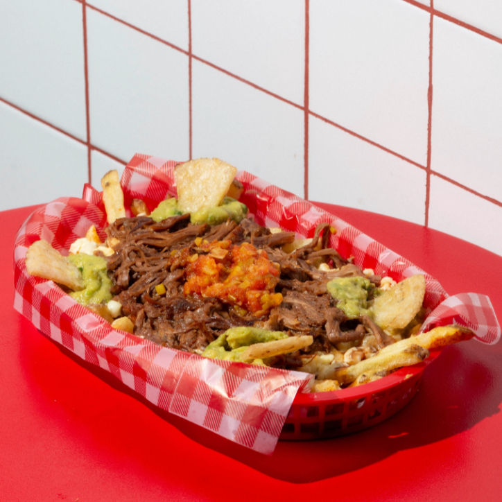 Papas a la francesas 250 g, queso rallado, jugosa carne desmechada, hogao, arepa,guacamole, salsa de perejil y BBQ.