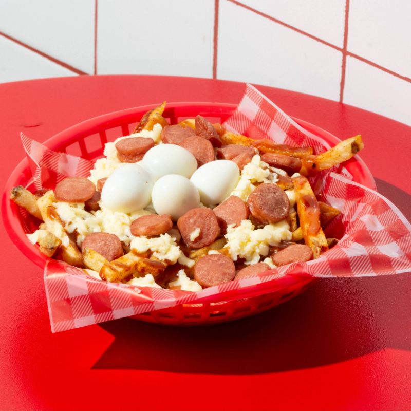 Papas a la francesas, queso rallado, salchicha, huevo de codorniz, salsa rosada de la casa y BBQ.
