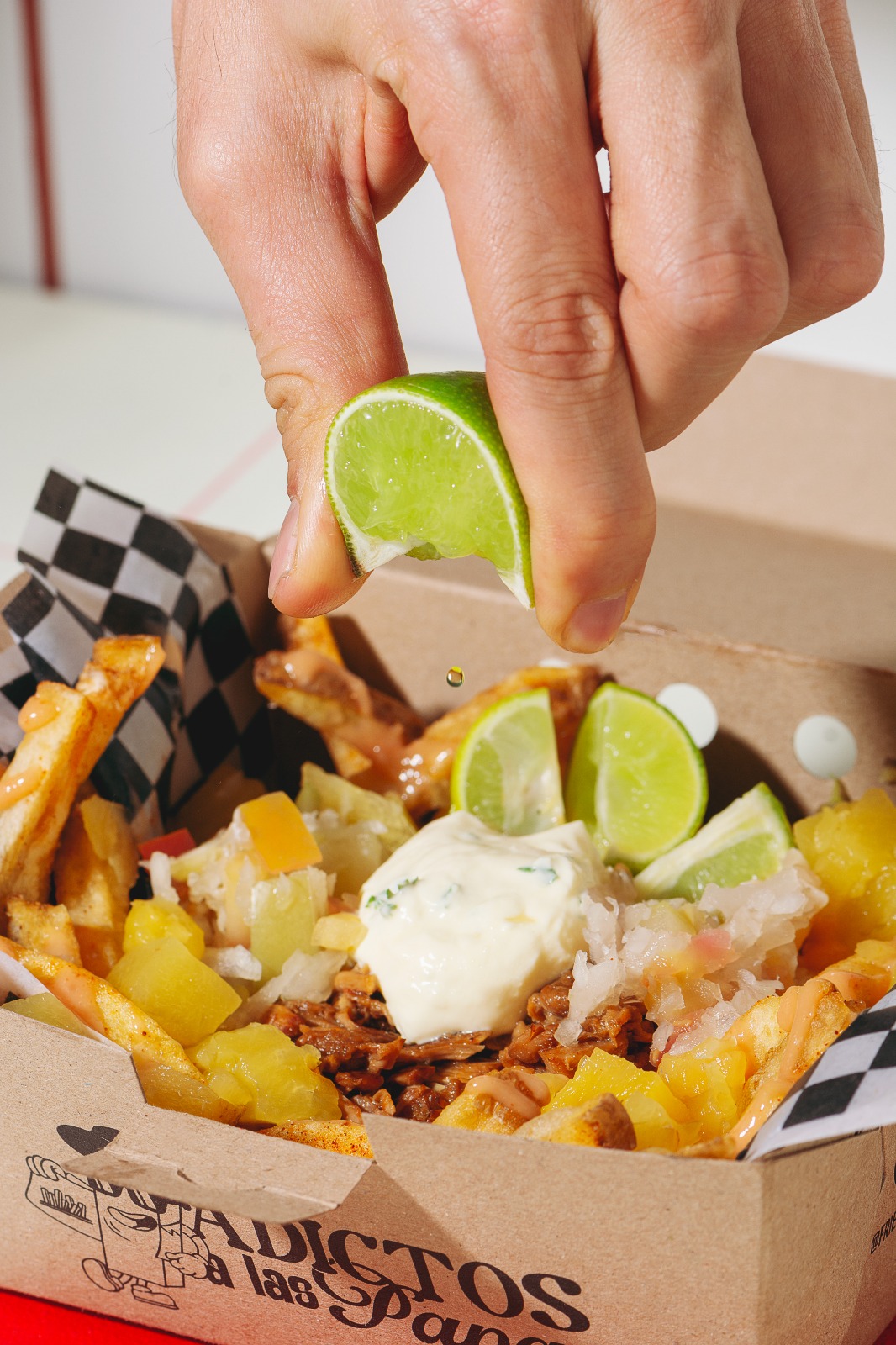 Papas a la francesas 250gr, carne pulled pork con toques de tamarindo, tocineta, queso cheddar, sour cream, puerro crocante, lluvia de perejil, salsa de ajo y salsa bbq sweet