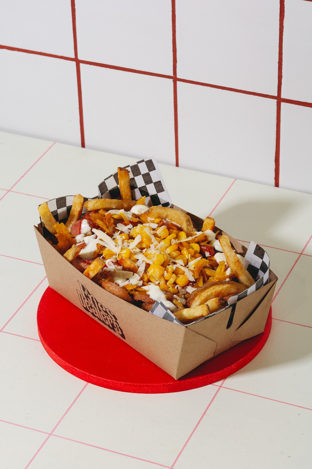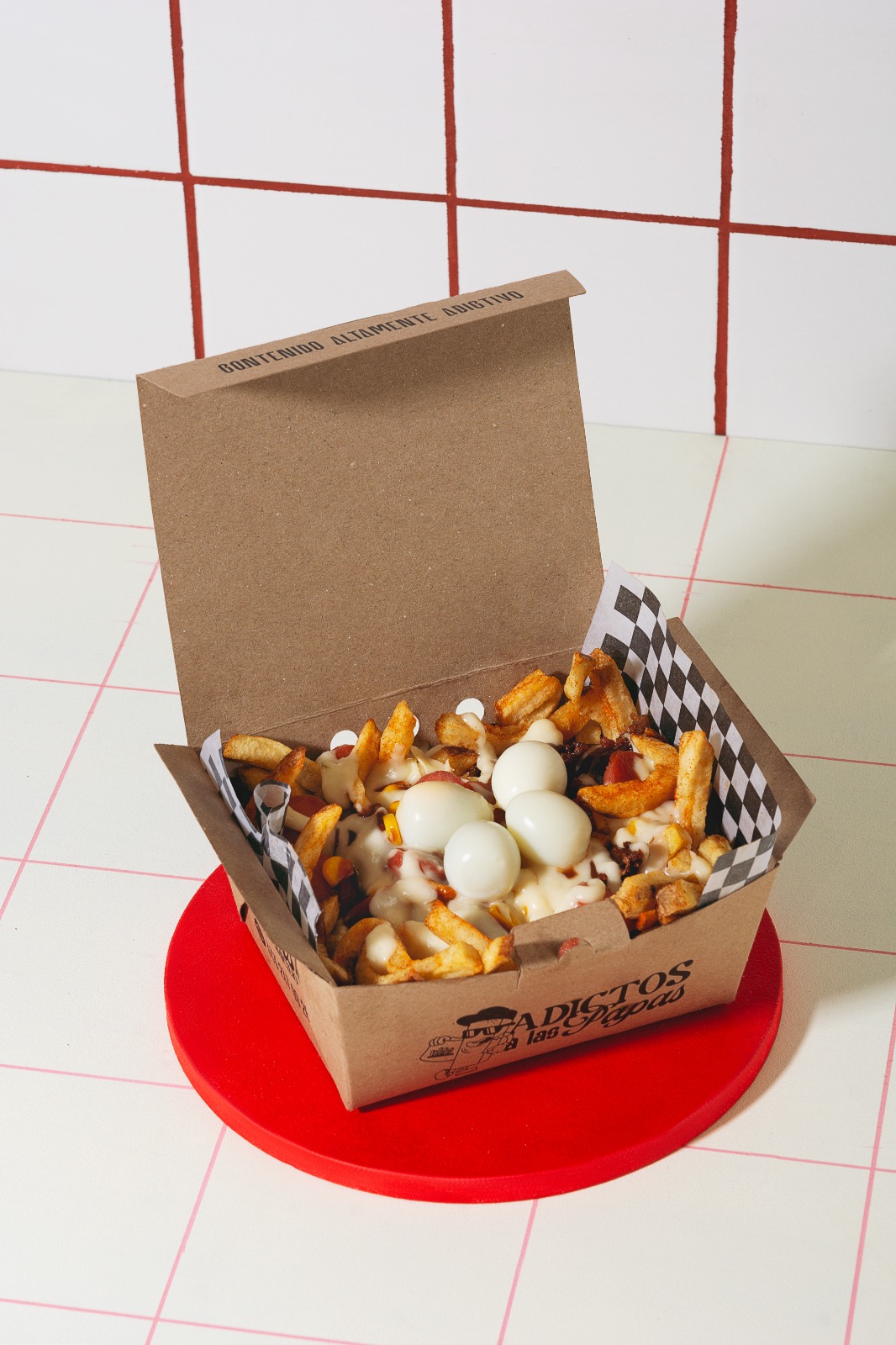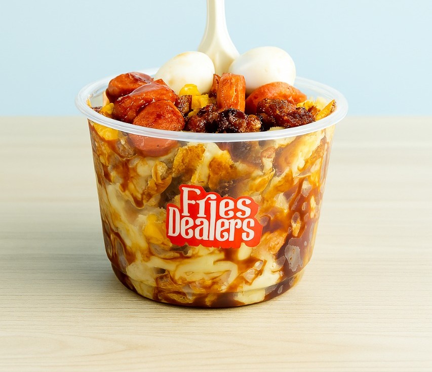 Papas a la francesas 250 g, queso rallado, salchicha, tocineta, maicitos, huevo de codorniz, salsa BBQ y ajo.