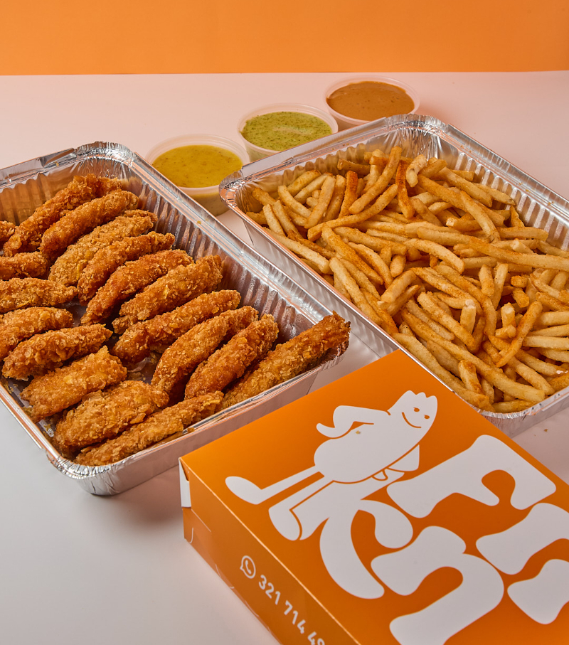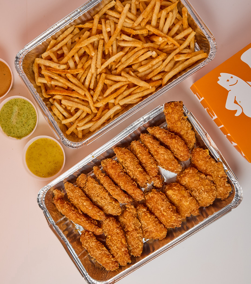 25 Tender de Pollo apanado (60gr/und), 6 rebanadas de Pan brioche con mantequilla, 4 ensalada coleslaw de 100gr, 480gr de papas a la francesa, 2 salsas de 7oz.