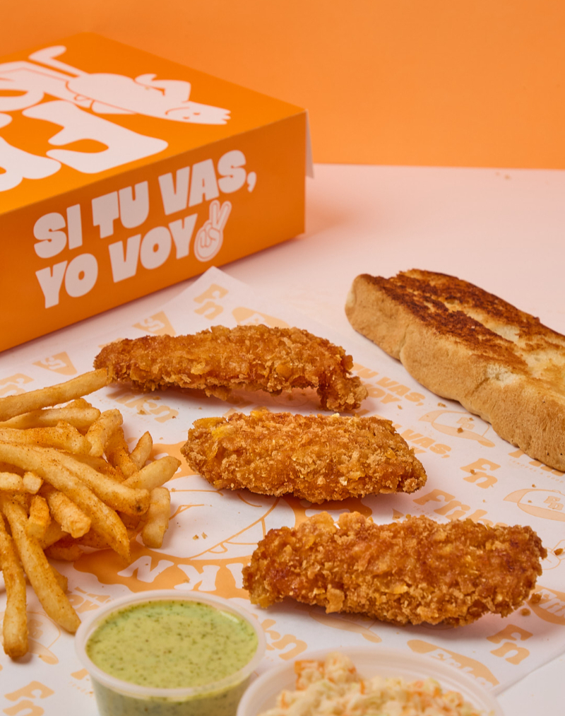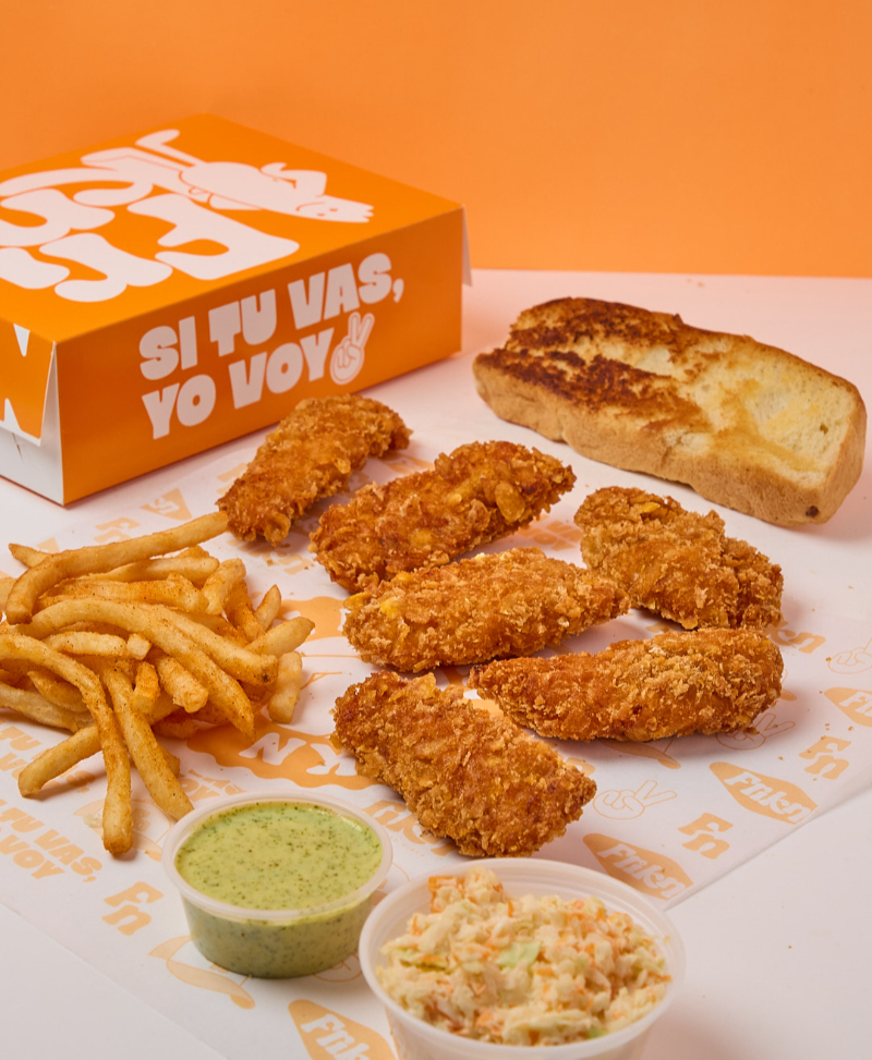 6 Tender de Pollo apanado (60gr/und), 2 rebanada de Pan brioche con mantequilla, 1 ensalada coleslaw de 90gr, 80gr de papas a la francesa, 2 salsas de 1oz. 2 bebidas