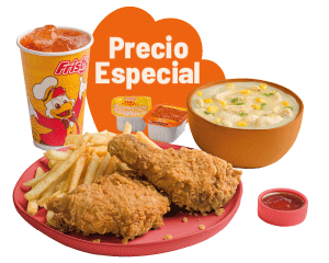 2 Presas apanadas, papas a la francesa mediana (60 g), sopa de verduras, ajiaquillo, consomé o sancochito (350 g) y gaseosa (325 ml)