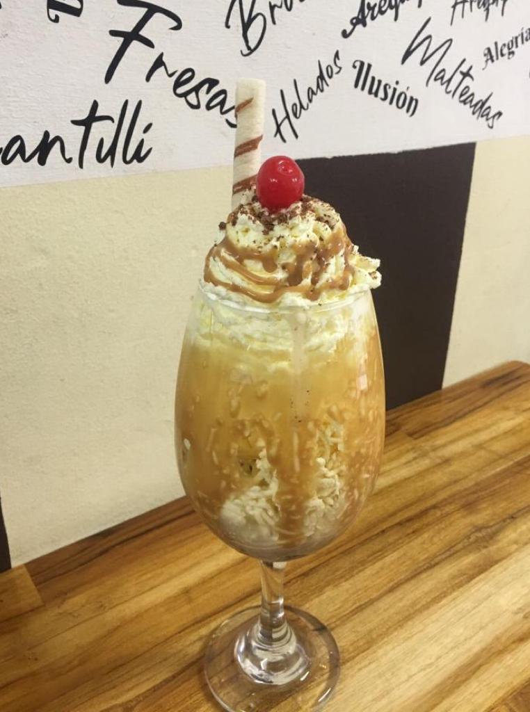 Dos sabores de helado, dos porciones de queso, chantilly, cereza, barquillo, salsa (arequipe).
