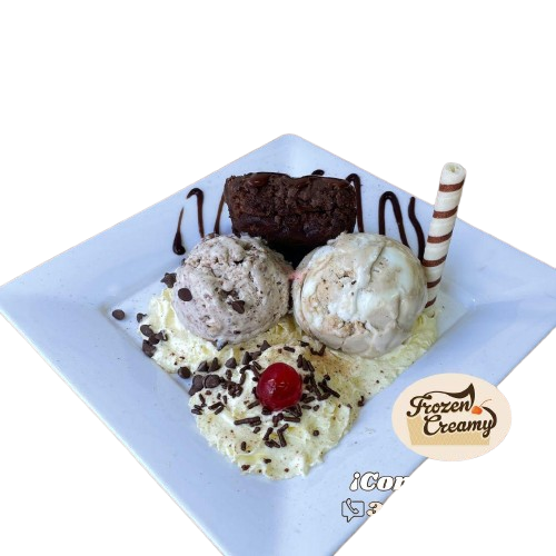 Brownie, dos sabores de helado a tu elección, chantillí, cereza, barquillo, piazza, lluvia de chocolate y salsas