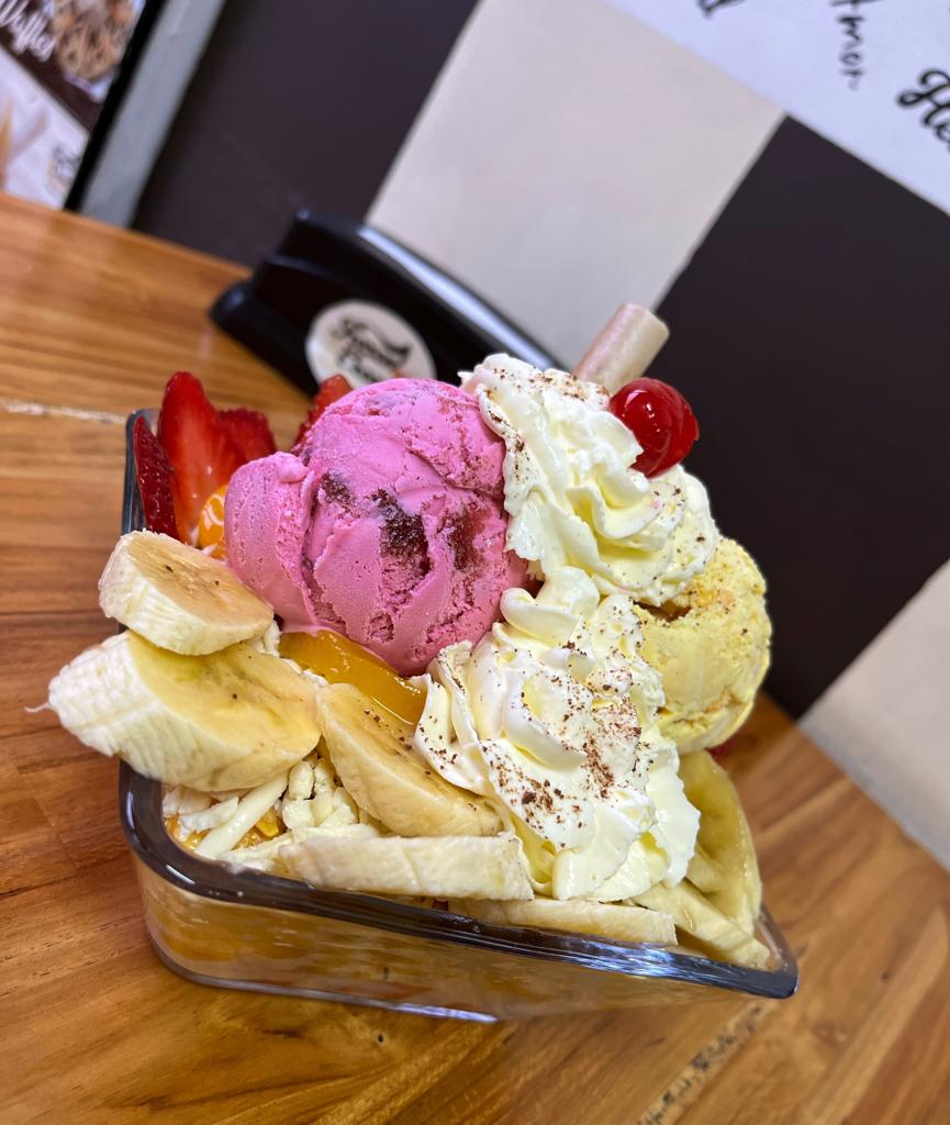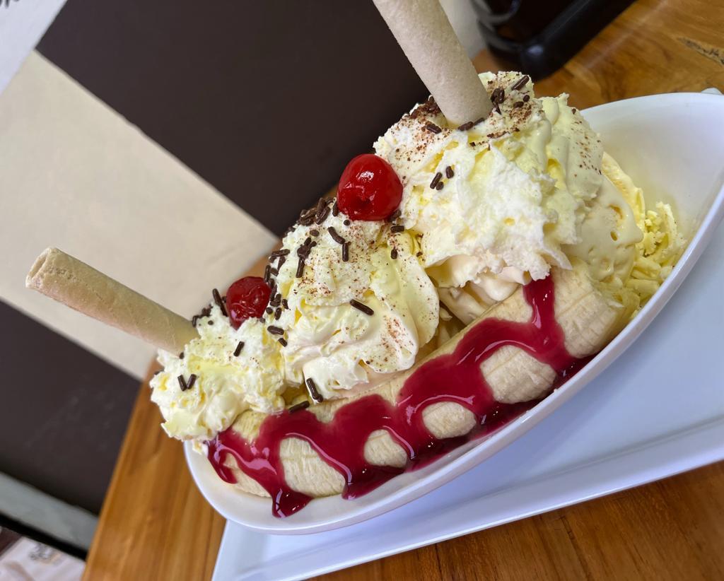 Banano, dos sabores de helado, queso, chantilly, lluvia de chocolate, cerezas, barquillos, salsa al gusto.