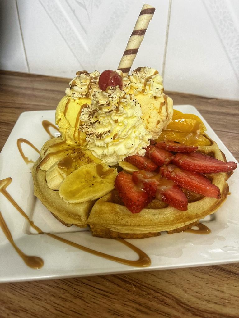 Waffle, dos sabores de helado, chantilly, banano, fresas, durazno, cereza, barquillo, salsa (arequipe).