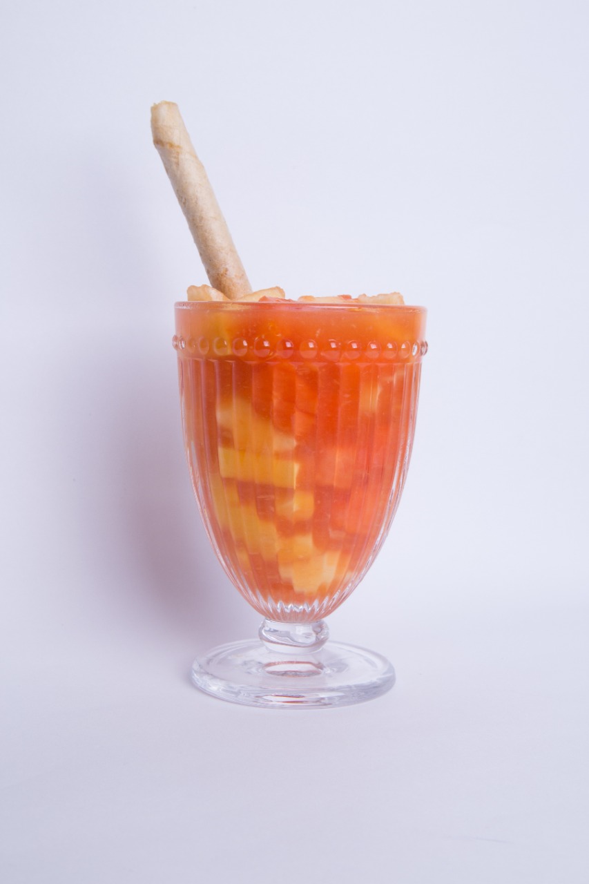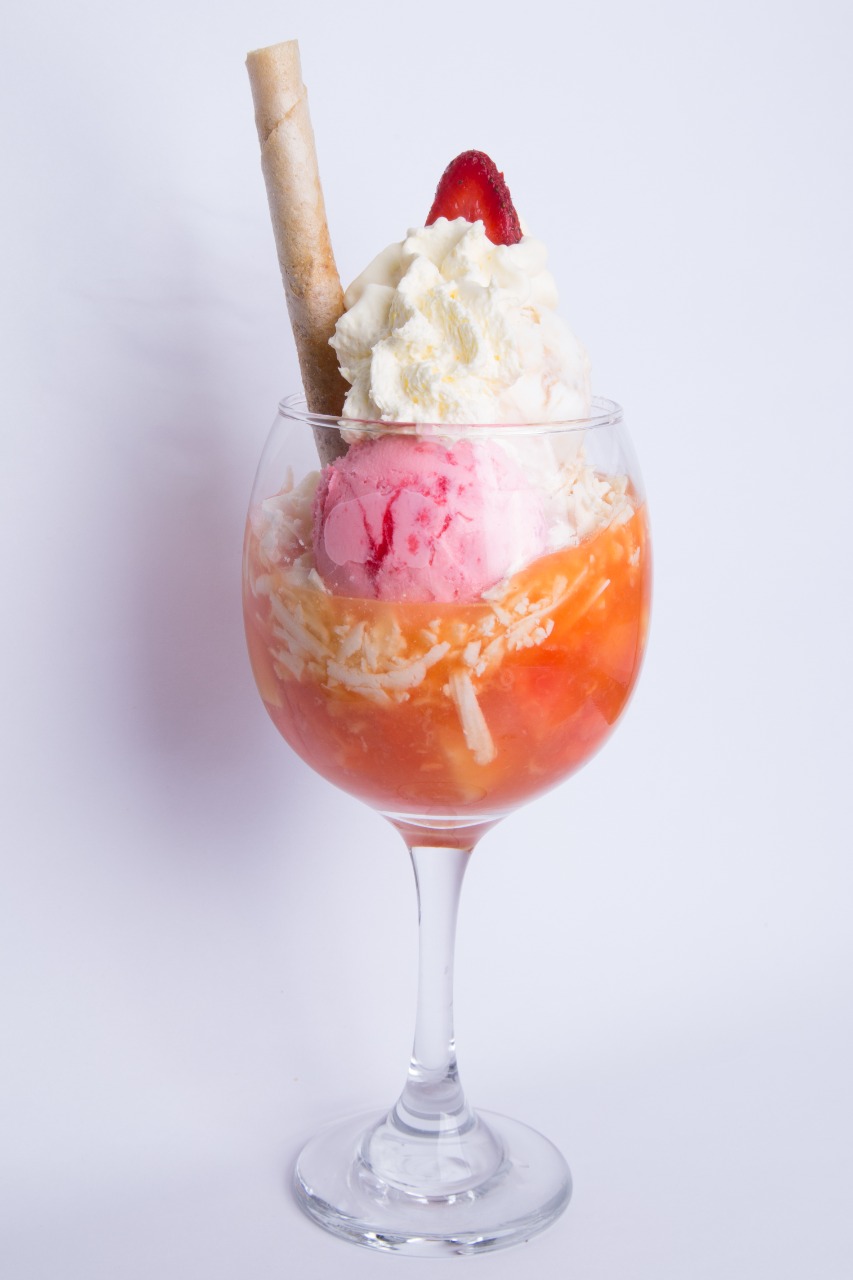 Fresca mezcla de frutas con un delicioso helado, una galleta artesanal y leche condensada.