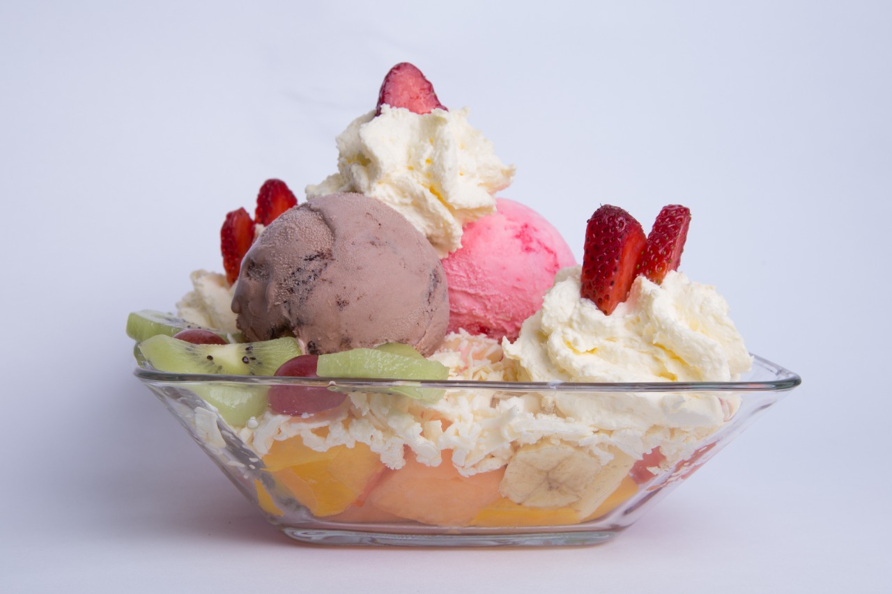 Deliciosa combinación de fruta fresca (durazno, fresa, kiwi) con dos bolas de helado, un toque te crema chantilly, y salsa de chocolate