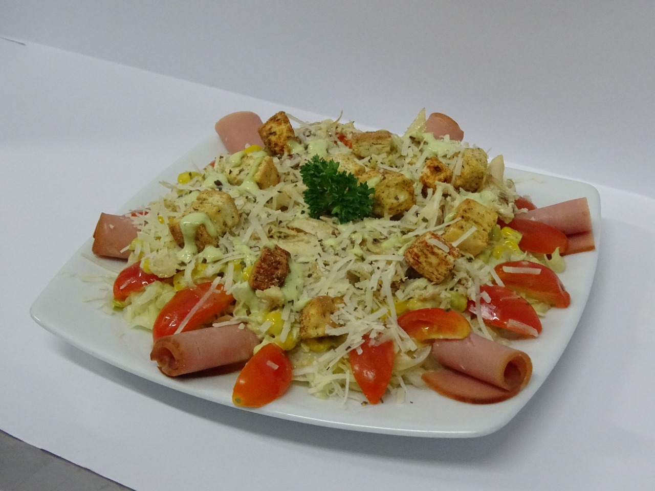 Fresca lechuga, tomate, pollo y maicitos con salsa de la casa, jamón, crotones y queso parmesano.
