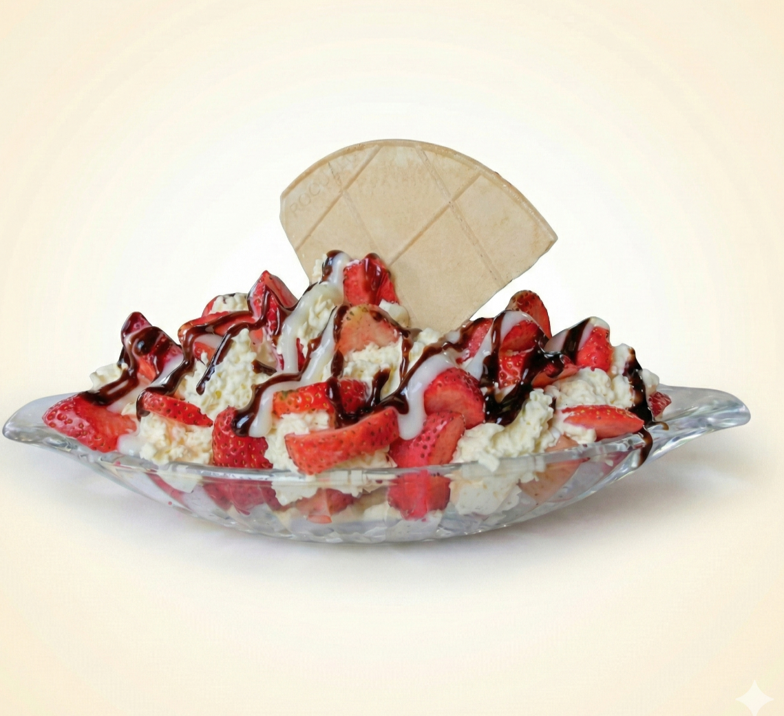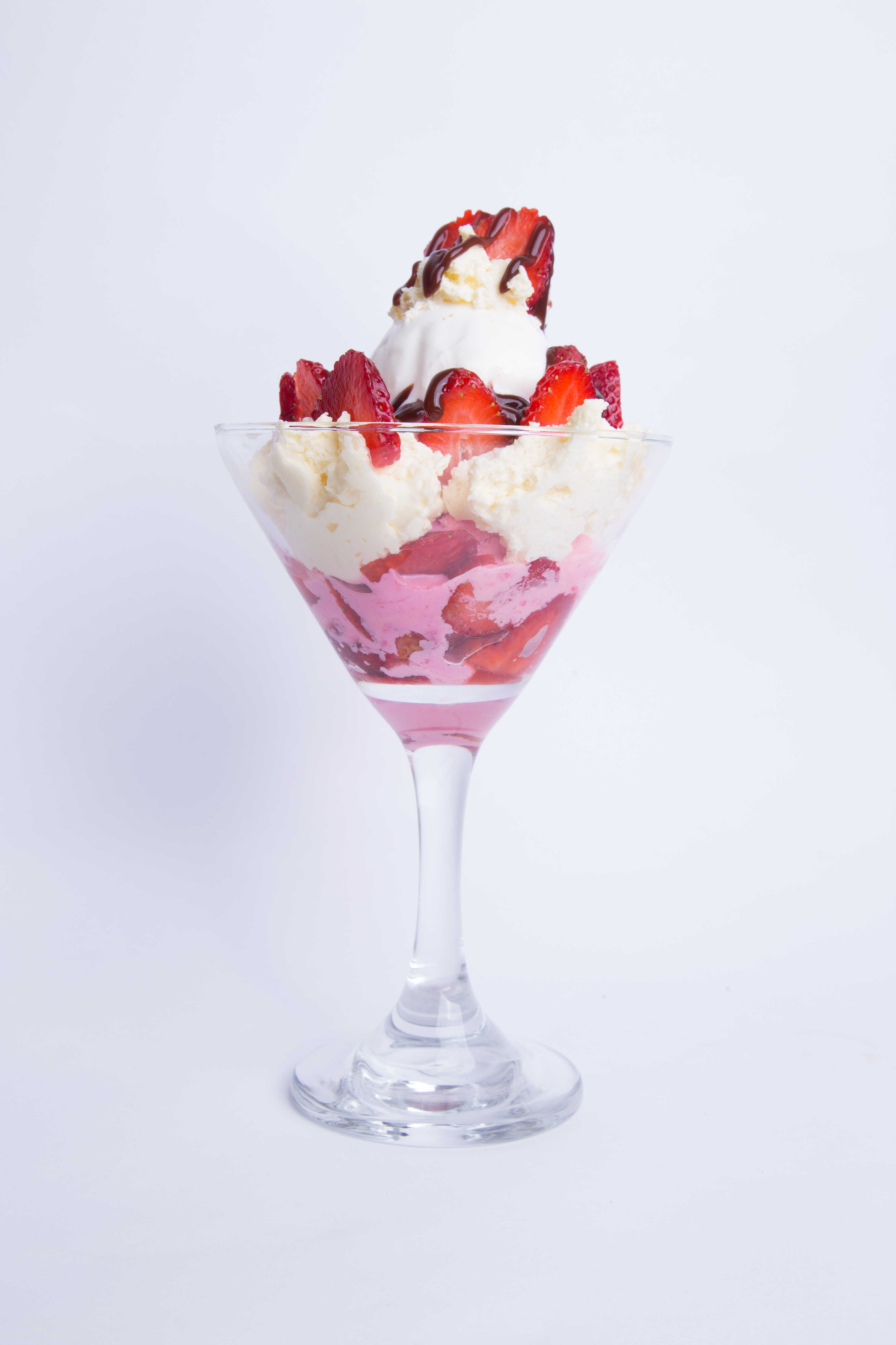 Provocativas fresas con la combinación ideal de dos bolas de helado, suave crema chantilly, y un toque de salsa de chocolate.