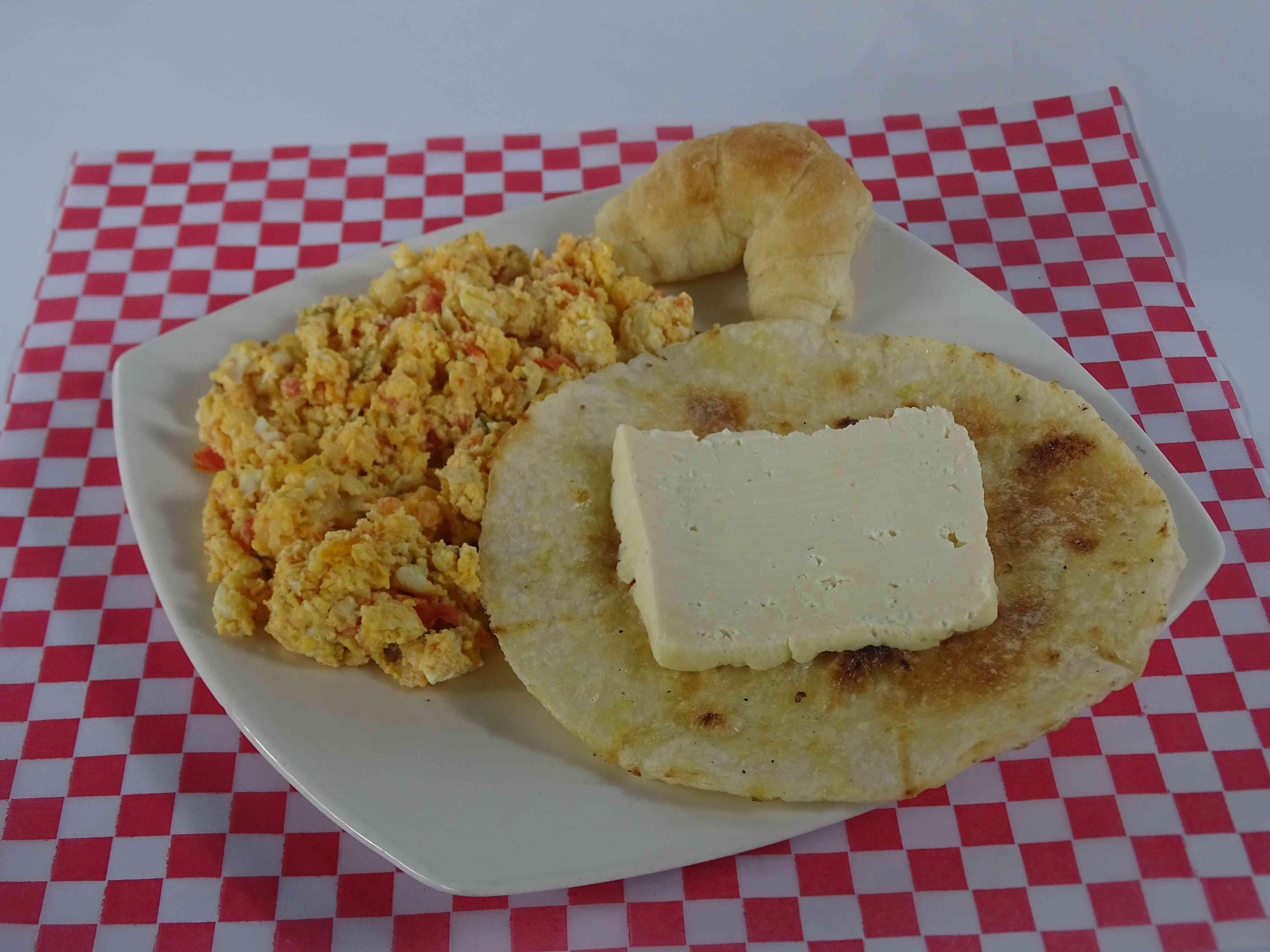 Porción de huevos, arepa con queso, un delicioso croissant y café con leche.