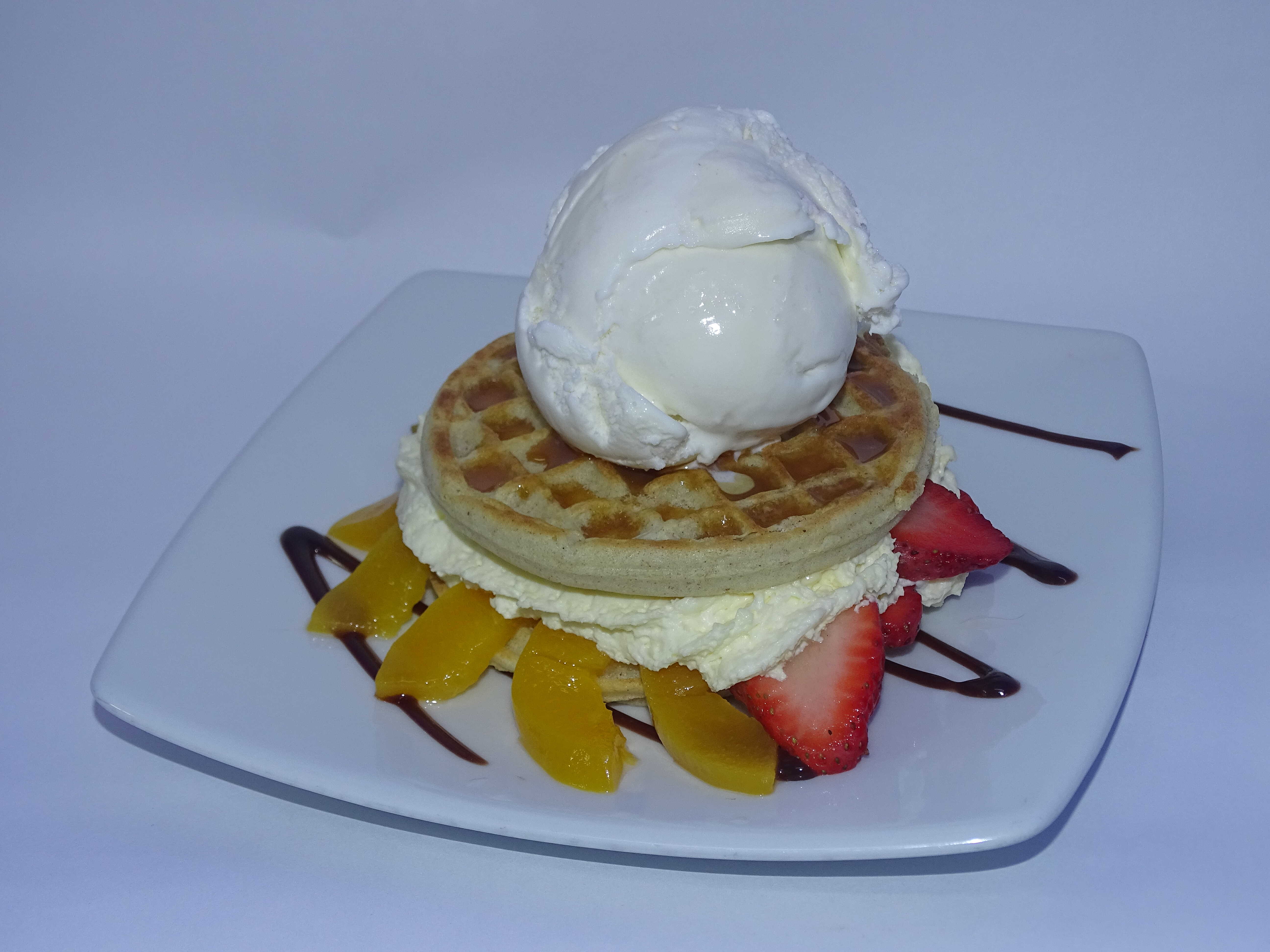 Waffle con fresas y duraznos, chantilly, helado, y para culminar una exquisita salsa.