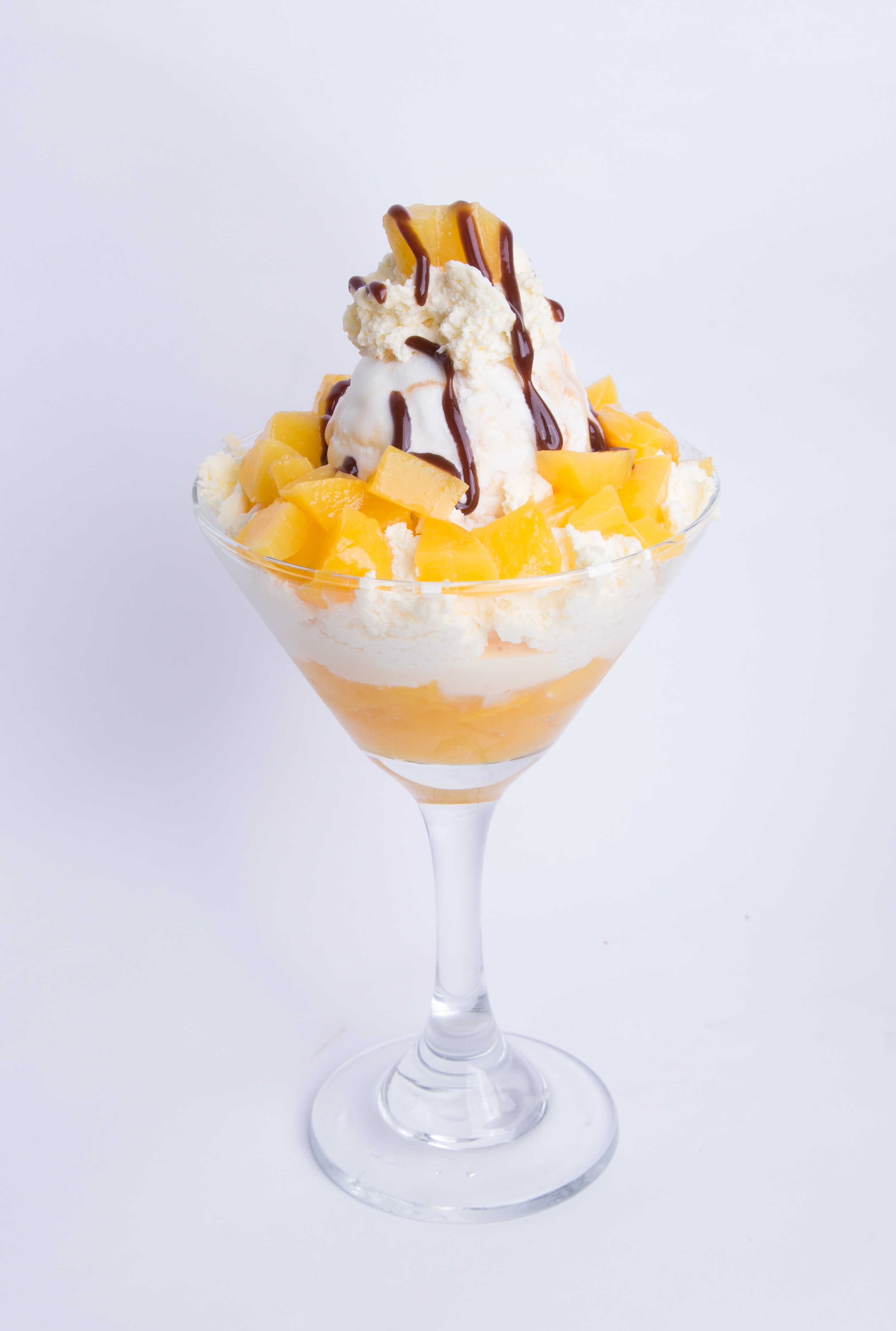 Frescos duraznos en almíbar, con una suave mezcla de dos bolas de helado, crema chantilly, y un toque de salsa de chocolate.