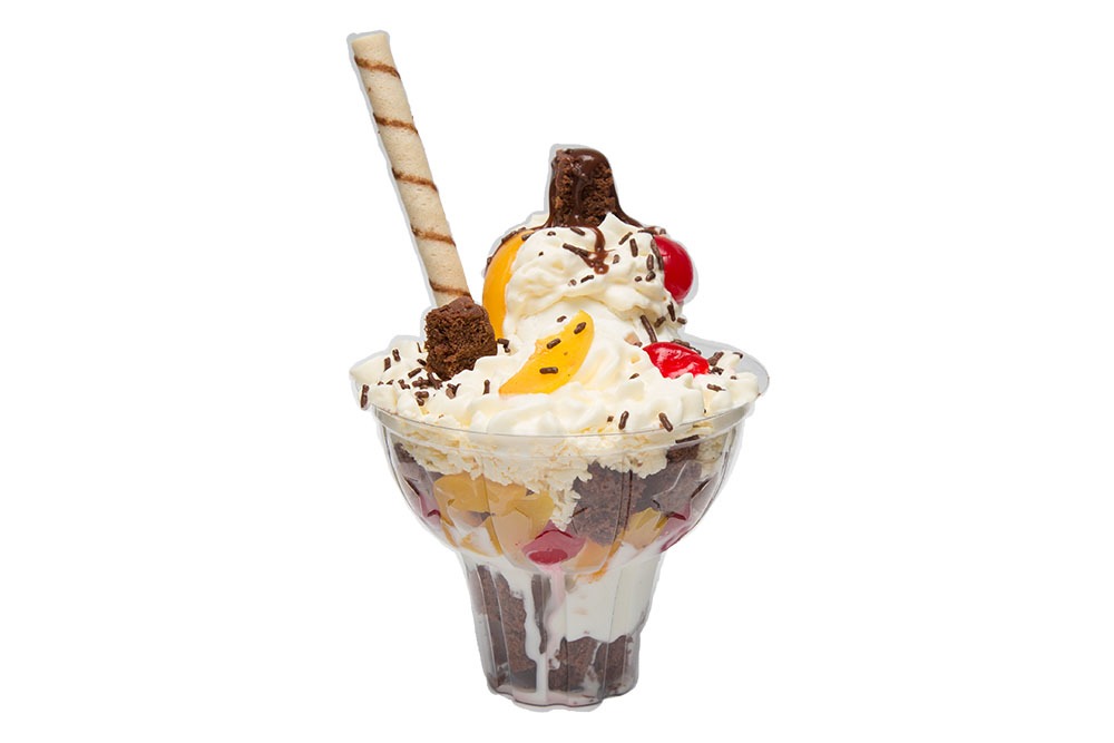 2 sabores de helados, trozos de fruta, kumis, queso, chantilly, barquillo, 2 salsas y cereza.