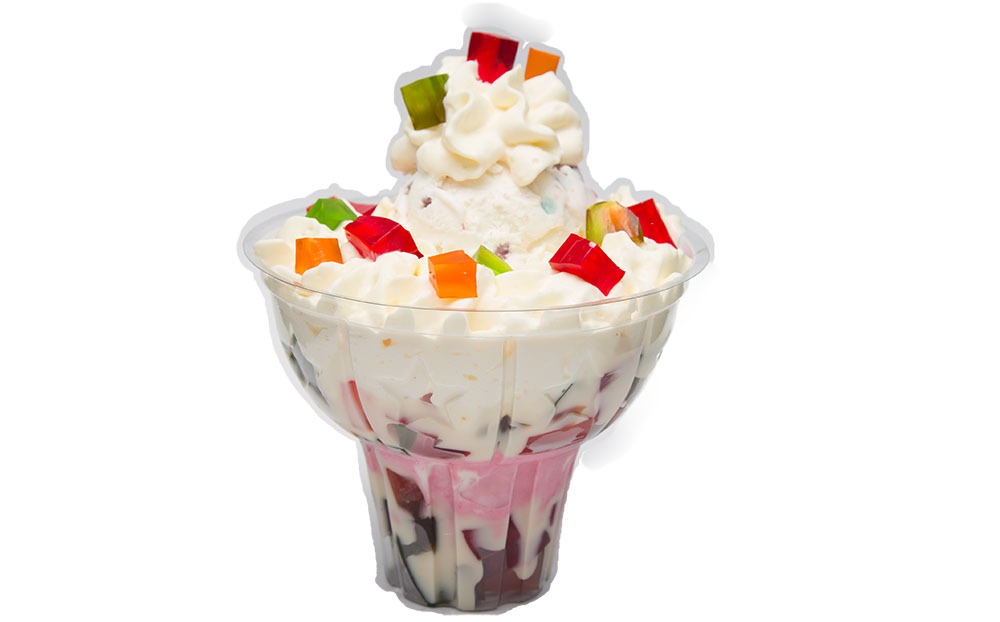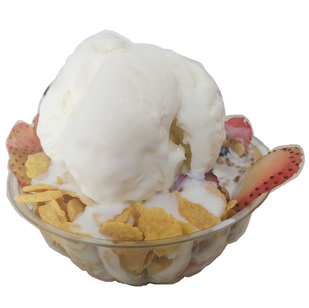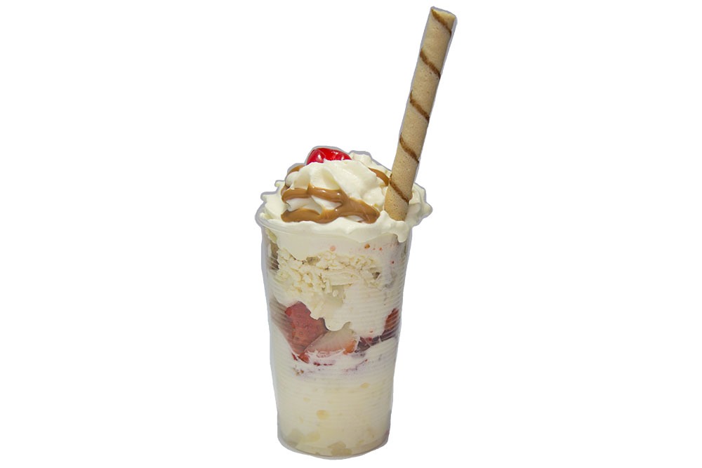 Platillo personal: 2 sabores de helado a tu preferencia, trozos de fruta, kumis, queso campesino, barquillo, 2 salsas a elección del cliente y cereza. Empacado en contenedor de 24 oz.