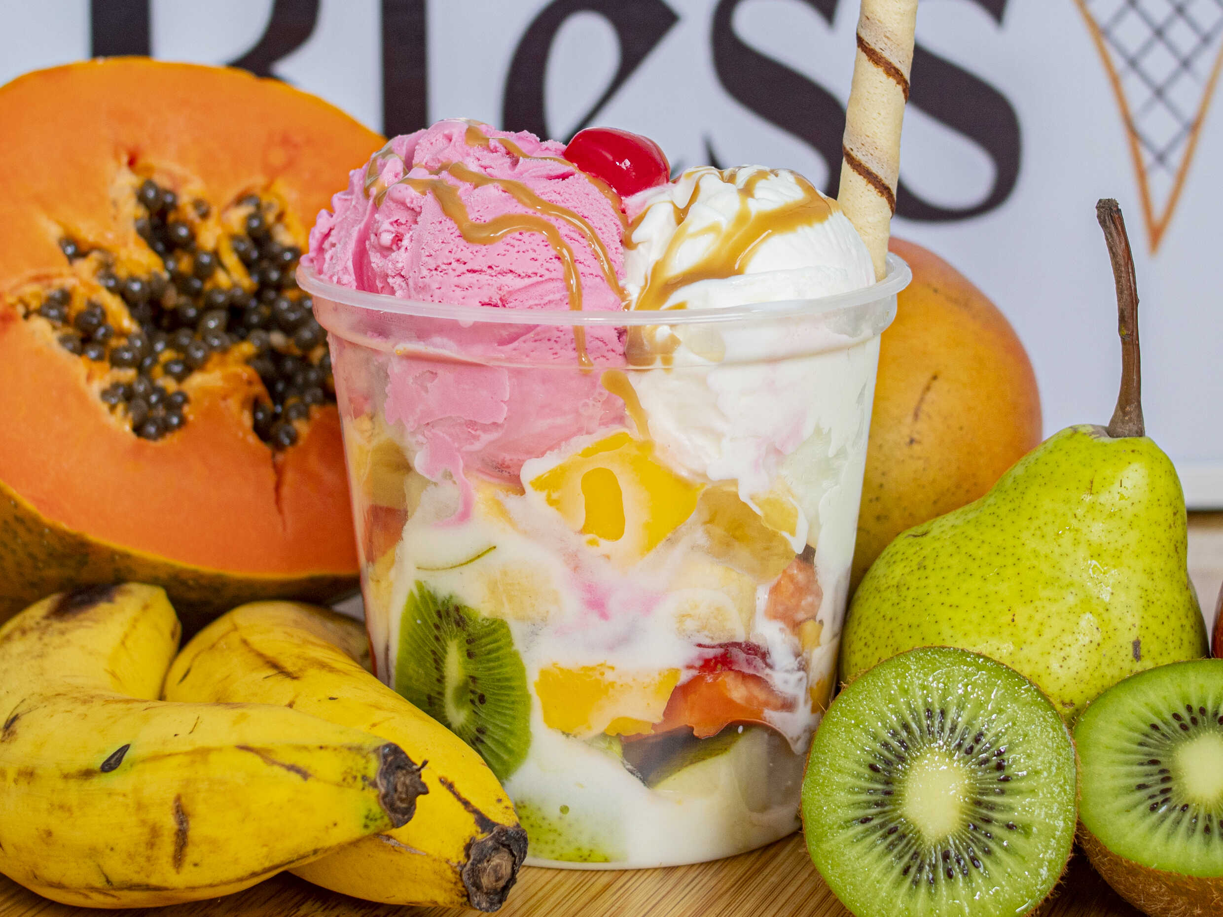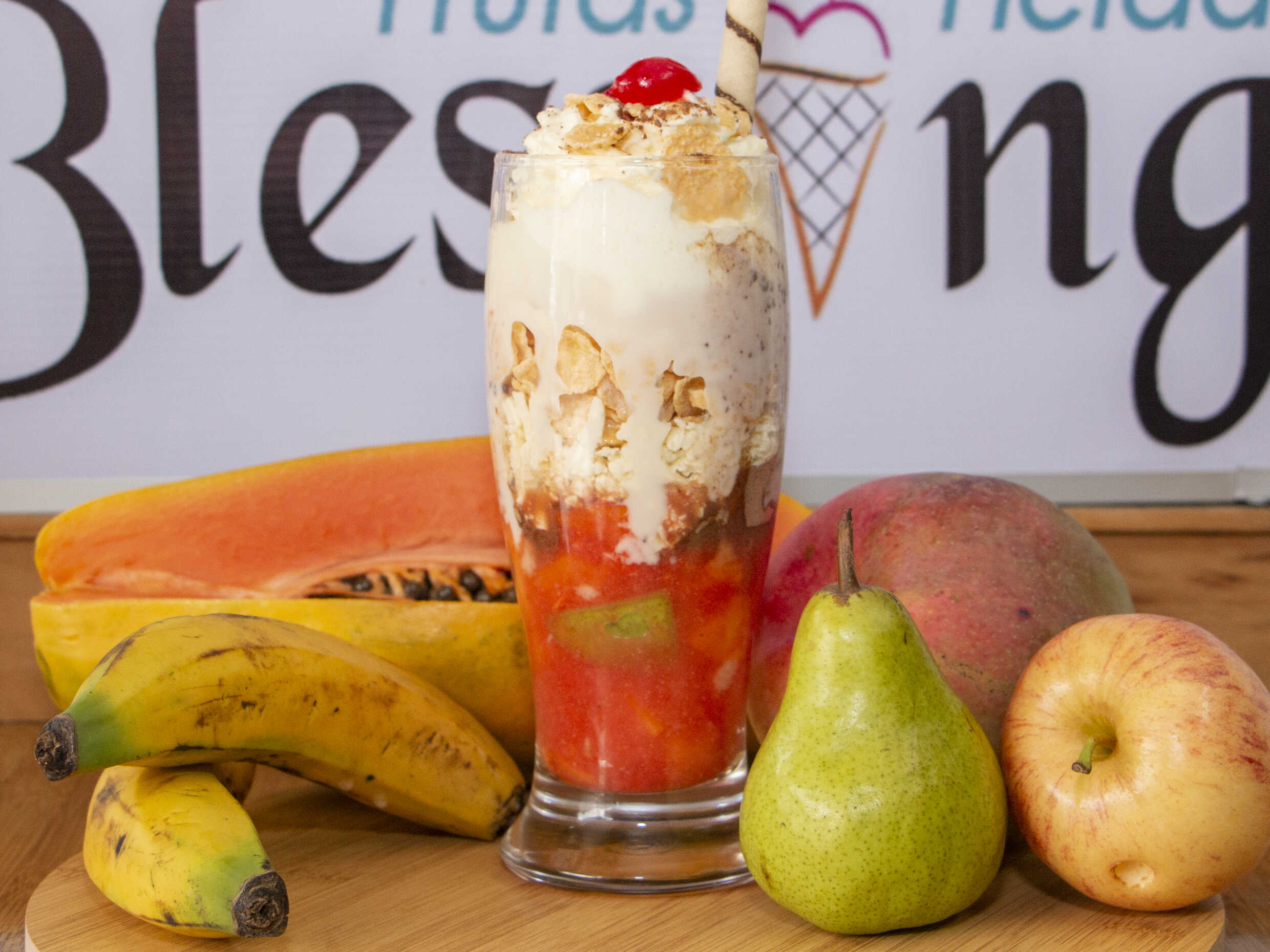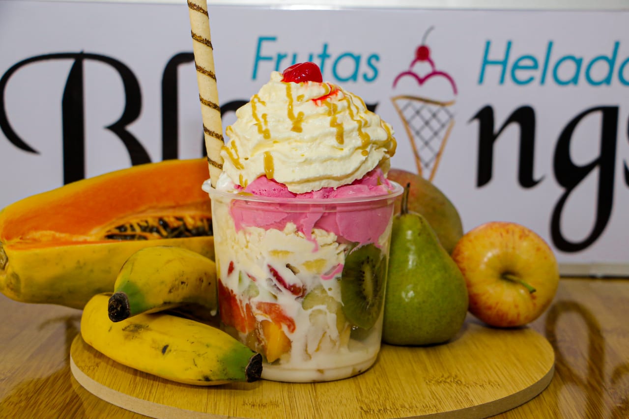 2 sabores de helados, trozos de frutas, kumis, barquillo, 2 salsas y cereza.
