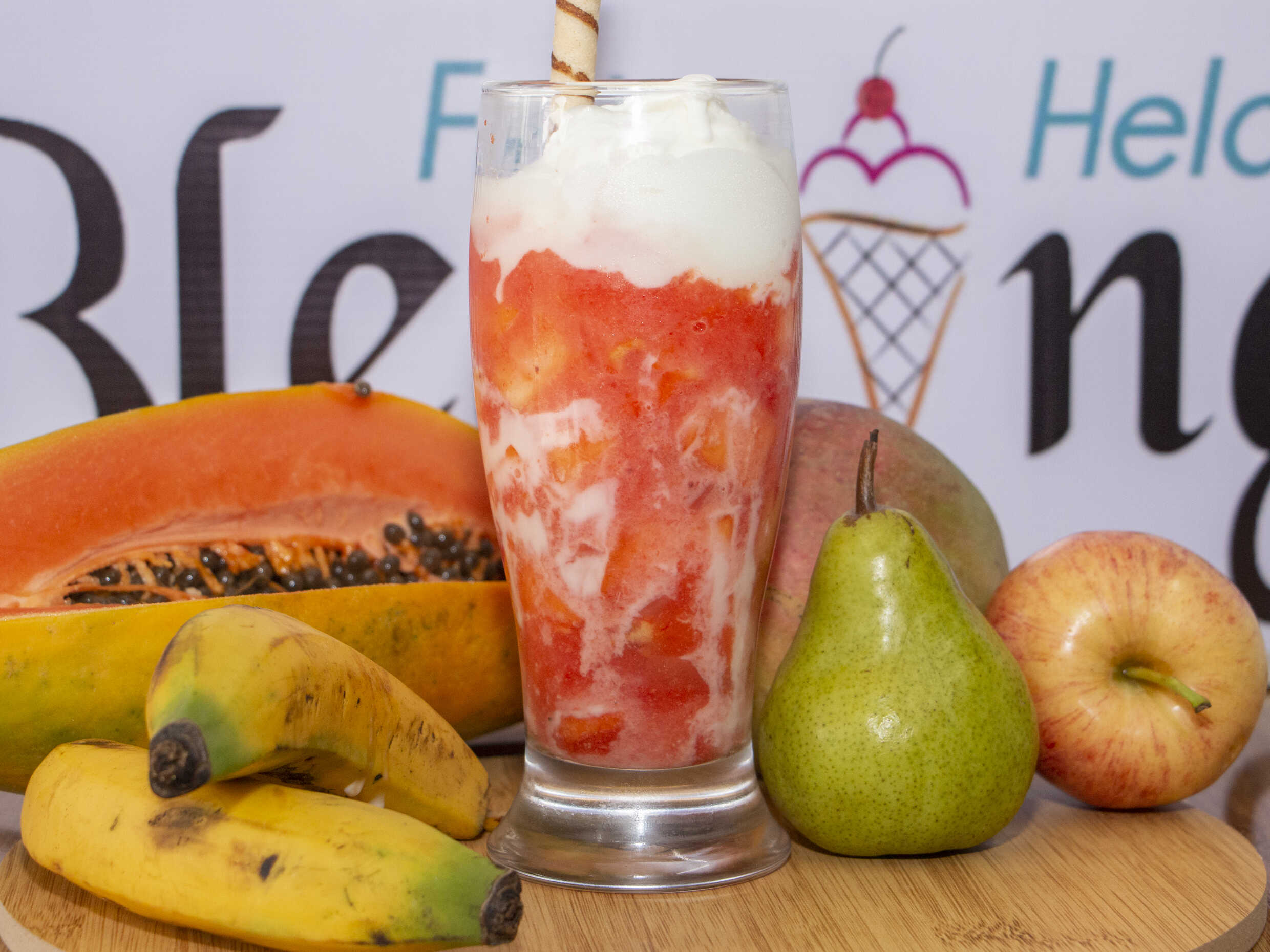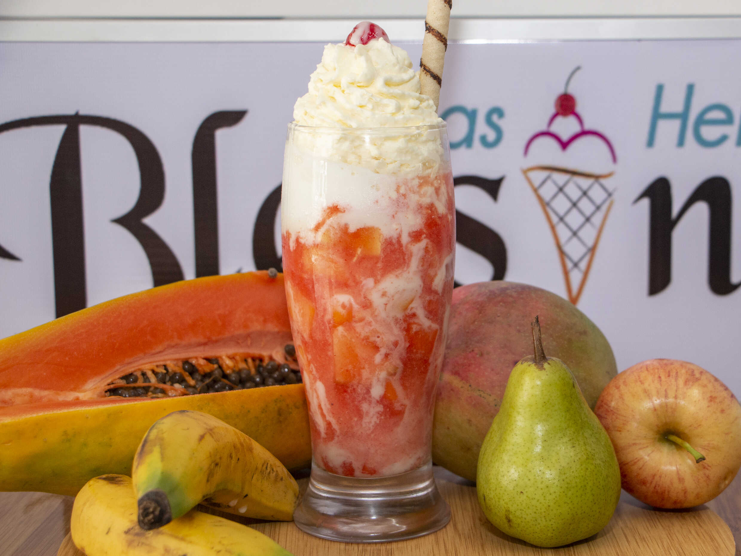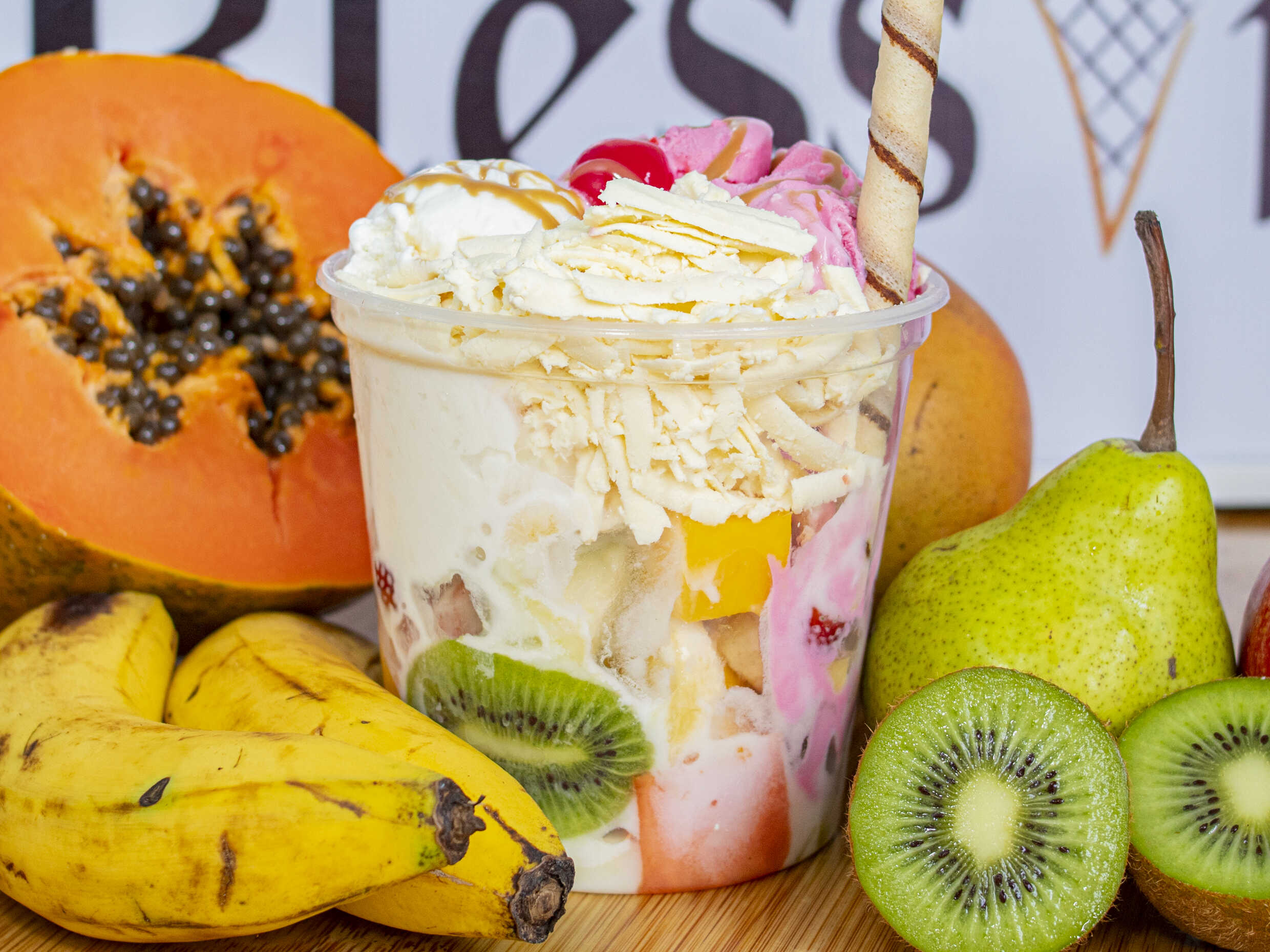 2 sabores de helados, trozos de frutas, kumis, barquillo, 2 salsas y cereza.