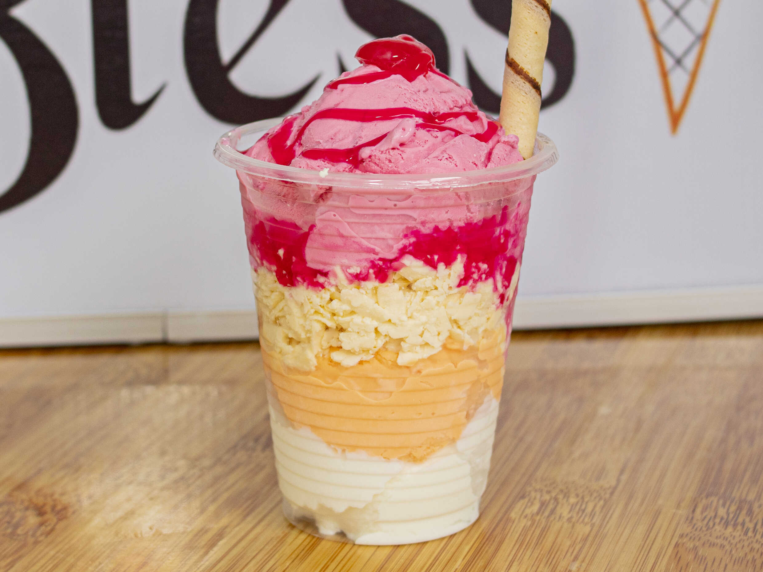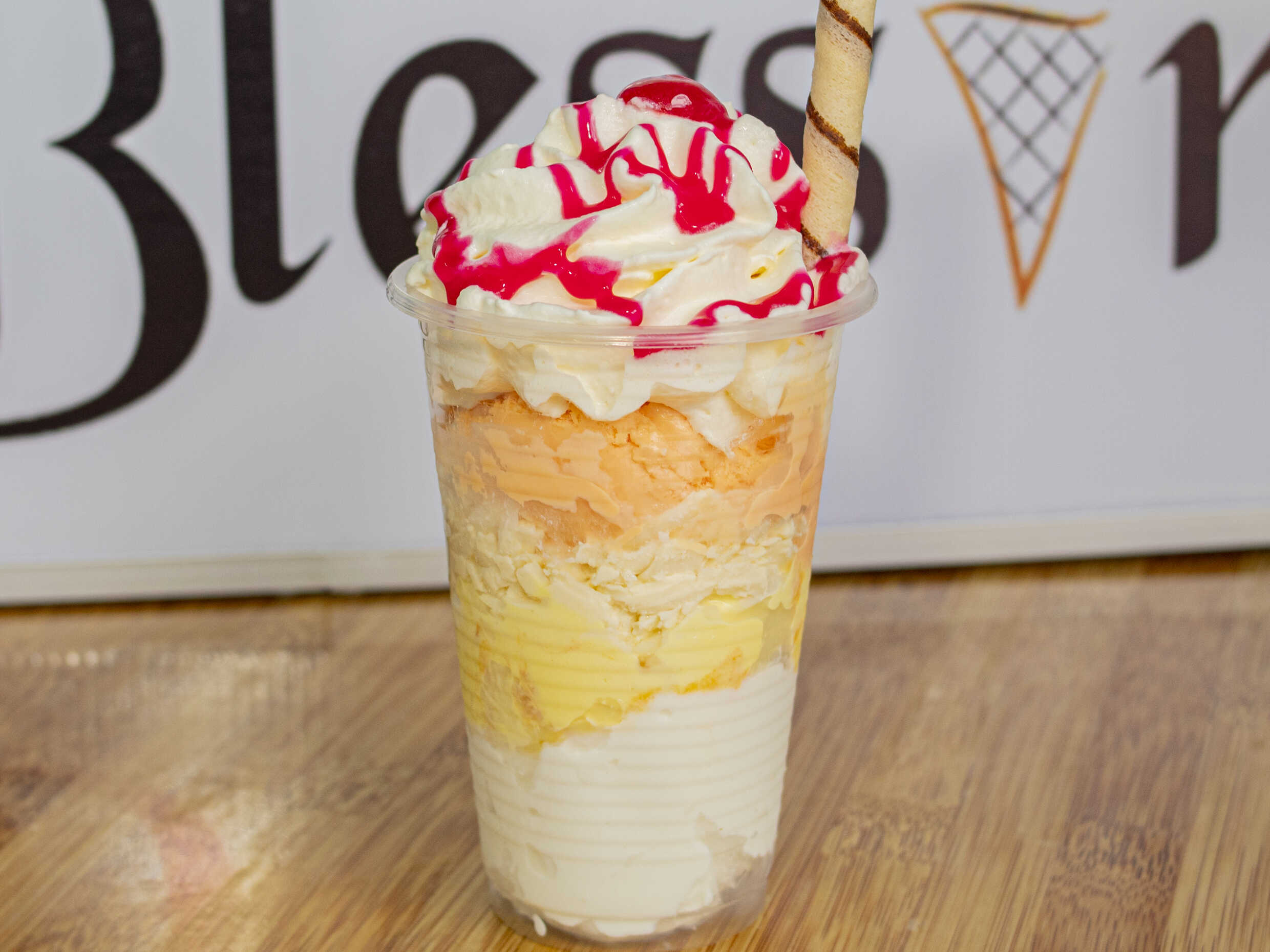 Un sabor de helado, salsa natural de maracuyá, barquillo piazza y chantilly.